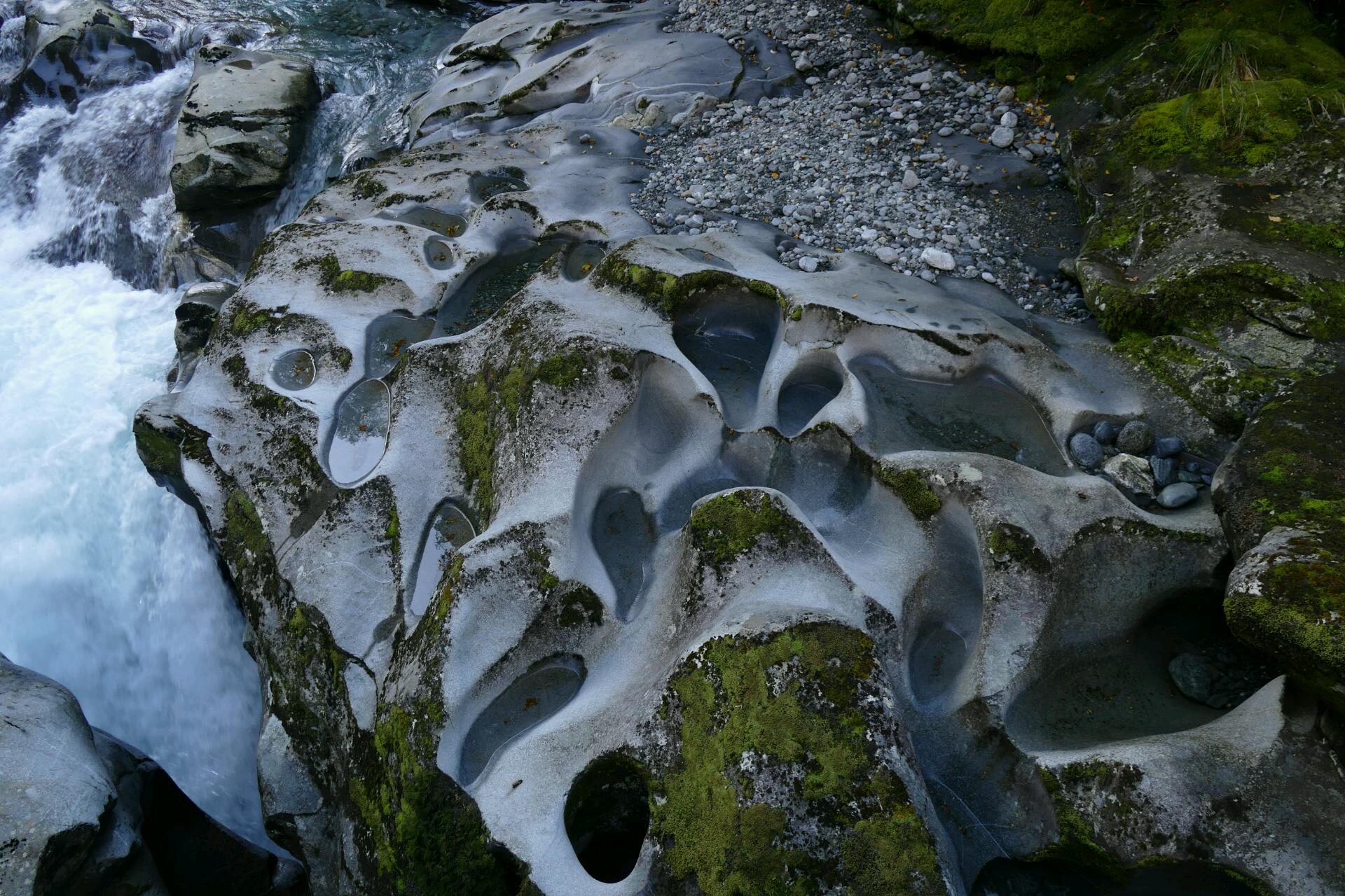 On voit différentes randonnées qui partent de la route mais les Néo-zélandais ne rigolent pas : on ne peut emprunter les sentiers qu’après avoir lavé ses chaussures, sous peine d’une amende de 200 $. Nous nous arrêtons sur le pont de Tukoko Valley puis à The Chasm Falls : un cours d’eau dont les roches du lit ont été polies par des pierres descendant de la montagne. Le résultat est extraordinaire : les rochers sont constellés de marmites parfaitement lisses !