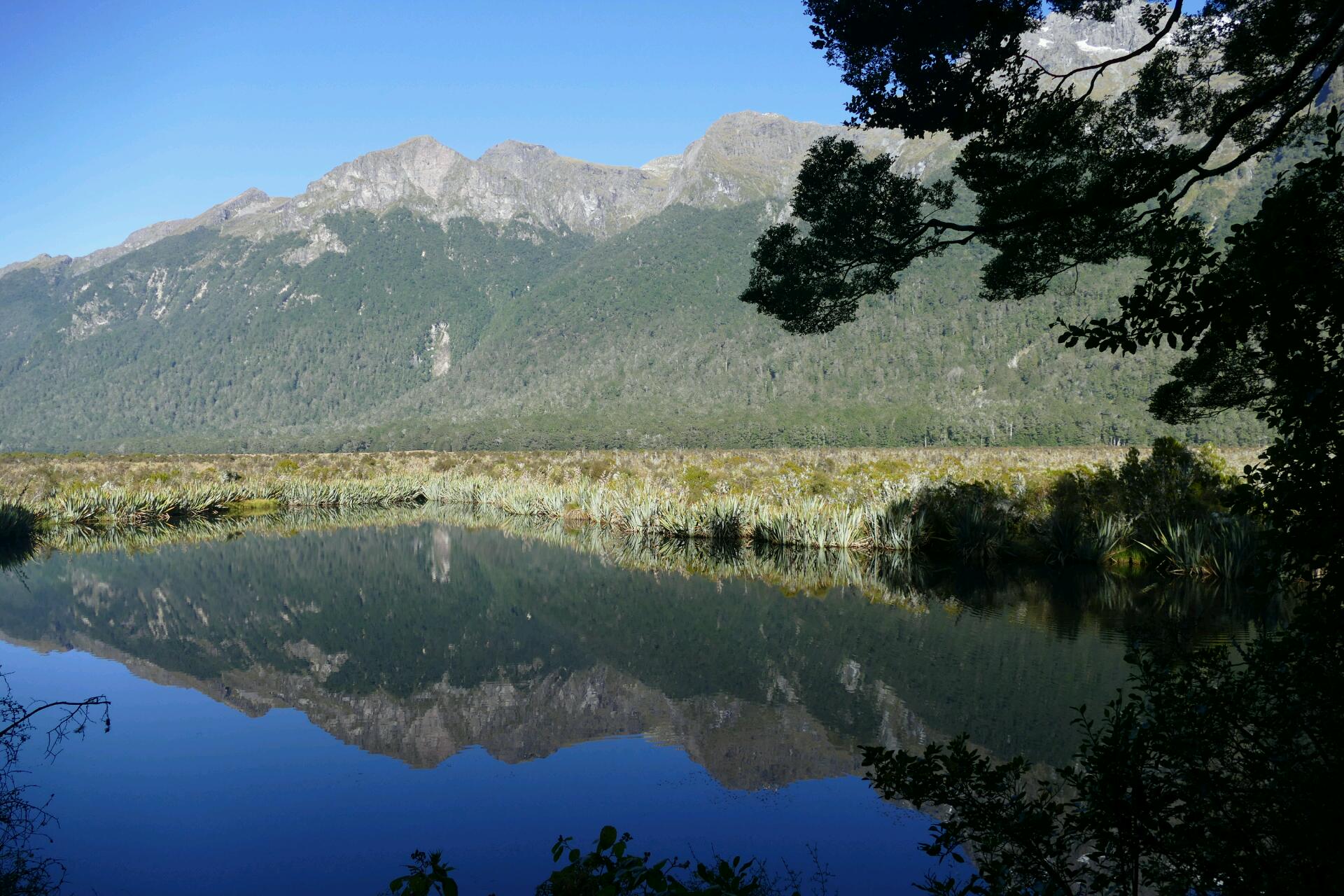 Nous nous arrêtons à plusieurs endroits en redescendant la route de Milford Sound. Nous faisons une petite marche de près d’un premier petit lac désert, puis une marche de 5 minutes aller-retour à Mirror Lakes : les Earl Mountains se reflètent à la surface de l’eau calme du lac. Nous sommes surpris de l’engouement pour Eglinton : des cars entiers (surtout des chinois mais pas seulement) s’arrêtent ici pour se photographier devant le paysage vallonné cerné de montagnes abruptes aux sommets enneigés. C’est beau mais bon, de là à s'arrêter tous exactement au même endroit...