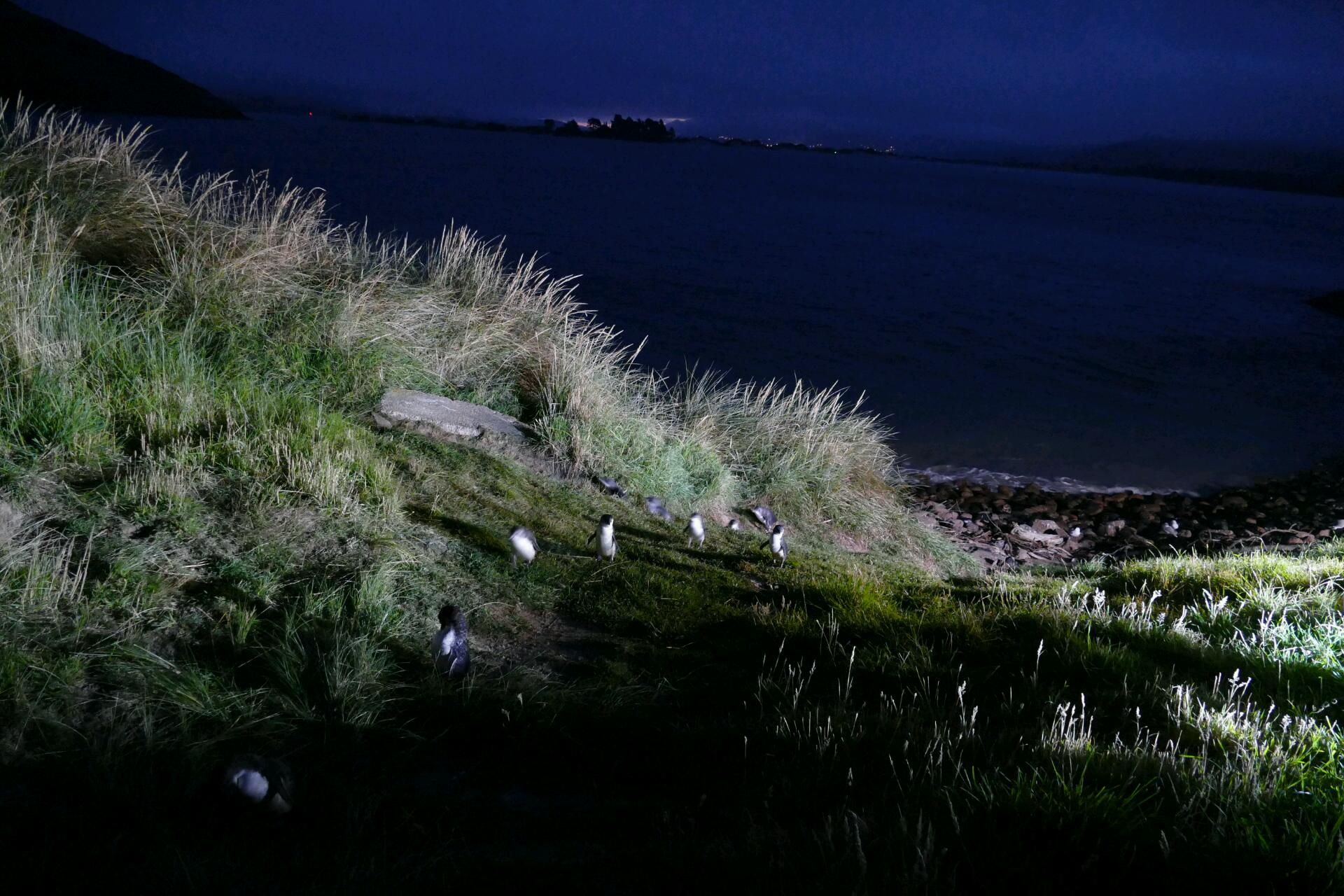 Nous observons quelques albatros royaux (c’est la seule colonie de ce type que l’on peut observer sur une terre habitée) avant de rentrer dans le centre où une exposition permanente nous permet d’attendre patiemment 20h30. Les pingouins bleus ne sortent de l’eau qu’à la nuit tombée. On y apprend par exemple qu’il existe plus d’une centaine d’espèces d’Albatros au monde, dont plusieurs en voie de disparition malheureusement. Munis de bracelets fluorescents, nous rejoignons le groupe et nous suivons le guide. A deux reprises les vagues ont déposé des dizaines de pingouins sur la plage et nous avons adoré le moment magique où des petits ventres blancs se dandinent pour regagner les terres. Ils sont vraiment tout petits. En effet, ils mesurent entre 34 et 43 centimètres et leur poids avoisine les 1kg. De ce fait on les appelle aussi les Manchots Pygmées. Ils vivent dans des terriers, comparables à ceux des lapins mais ils n’ont pas de galeries. Ce pingouin possède un plumage bleu indigo ou argenté très caractéristique, au niveau de la tête, du dos, de la queue et des ailes, lui valant le surnom de petit manchot bleu. Les manchots pygmées vivent autour du littoral de la Nouvelle-Zélande mais également au sud de la Tasmanie et de l’Australie. Contrairement aux pingouins à yeux jaunes, iIs vivent dans de grandes colonies toute l’année. Les manchots pygmées préfèrent les plages de sable et rocheuses. Ils se nourrissent de petits poissons, de calmars, et de krill pour lesquels ils voyagent et plongent la majorité de leur temps. Ils peuvent passer plus de 3 mois en mer pour pouvoir manger.
