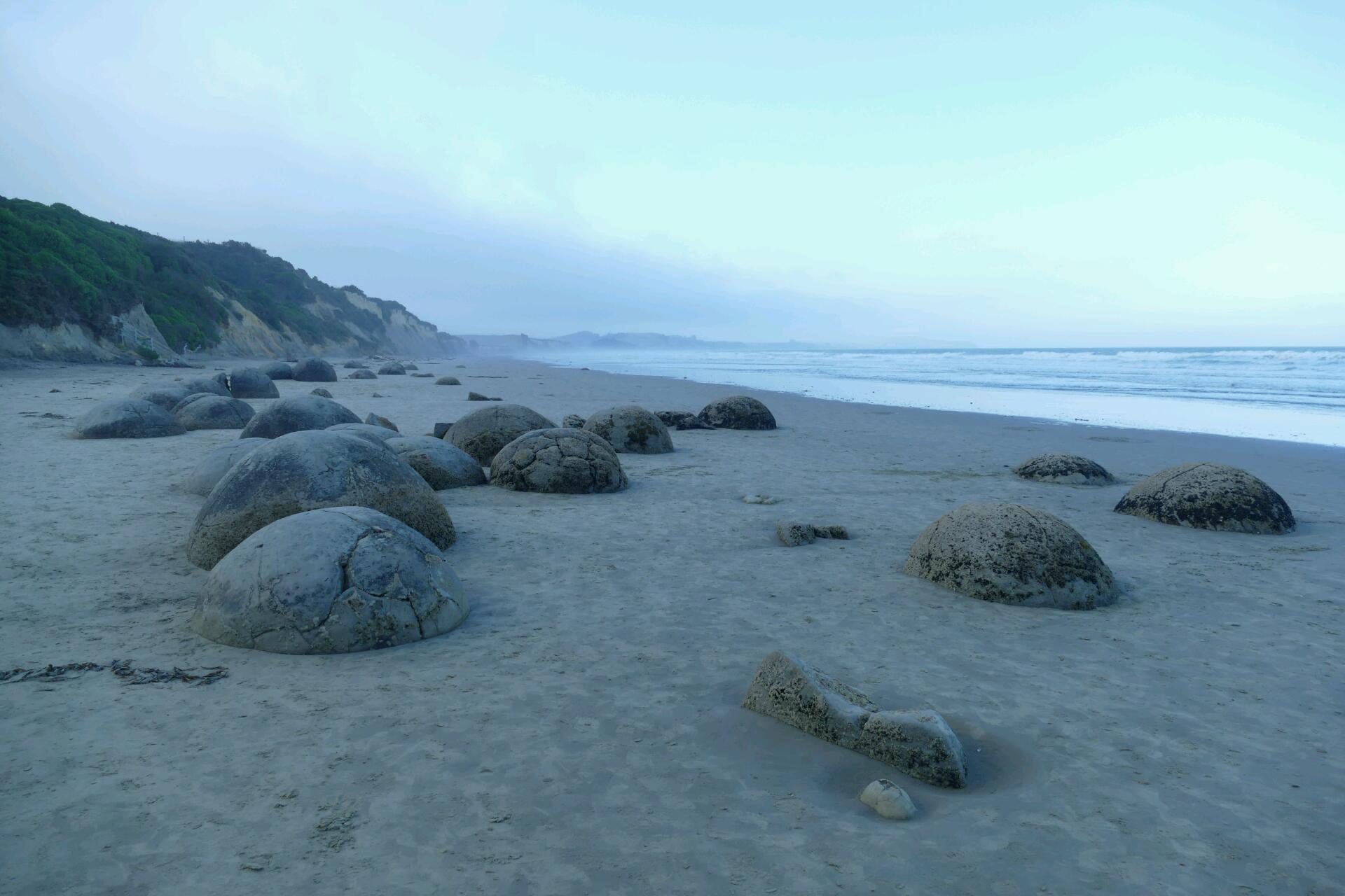 Nous faisons quelques kilomètres avant de nous arrêter de nouveau. Depuis le parking, une petite marche de 15 minutes sur une plage déserte nous conduit vers les Moeraki Boulders. Il s’agirait de dépôts de calcite autour de noyaux résultant de l'accumulation de débris de végétaux au fond de l'océan qui, après avoir passé des millions d’années dans le sable auraient donné ces formations étranges presque sphériques. Plusieurs de ces masses de sédiments seraient encore cachées sous le sable à attendre patiemment de sortir. Certains les nomment aussi "crottins fossilisés de dinosaures".