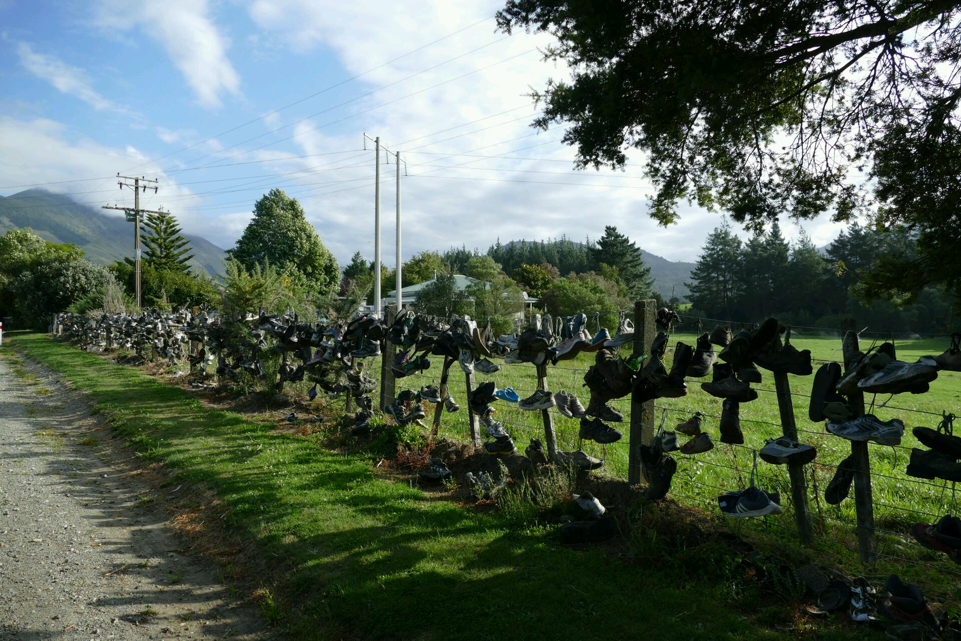 La route que nous avions prévu de prendre le long de la côte étant coupée depuis le tremblement de terre de novembre dernier, nous sommes donc déroutés sur l’unique autre route permettant de rejoindre le Nord, qui passe par Murchison. Cette dernière, nettement plus longue, est également bien impactée par le tremblement de terre (nombreuses failles dans le goudron, ponts écroulés …). Du coup, nous roulons plus de la moitié de la route entre 30 et 50 km/h. Nous longeons des cultures de kiwis et de pommes. Souvent, des fruits sont disposés dans de petites boîtes au bord de la route, on peut se servir et on met l’argent dans une boîte à côté. A Nelson, nous faisons une folie : nous achetons un poulet cuit que nous allons déguster dans un parc. Nous atteignons Abel Tasman en fin de journée après avoir roulé toute la journée. Heureusement, nous faisons de multiples arrêts photos de boîtes aux lettres qui nous permettent de nous dégourdir les jambes. De plus nous sommes distraits par un nouvel endroit insolite : les soutien-gorges sont remplacés par des chaussures. Manu a accroché ses Crocs le temps d’une photo mais nous ne pouvons pas les laisser sinon, il continue pieds nus !