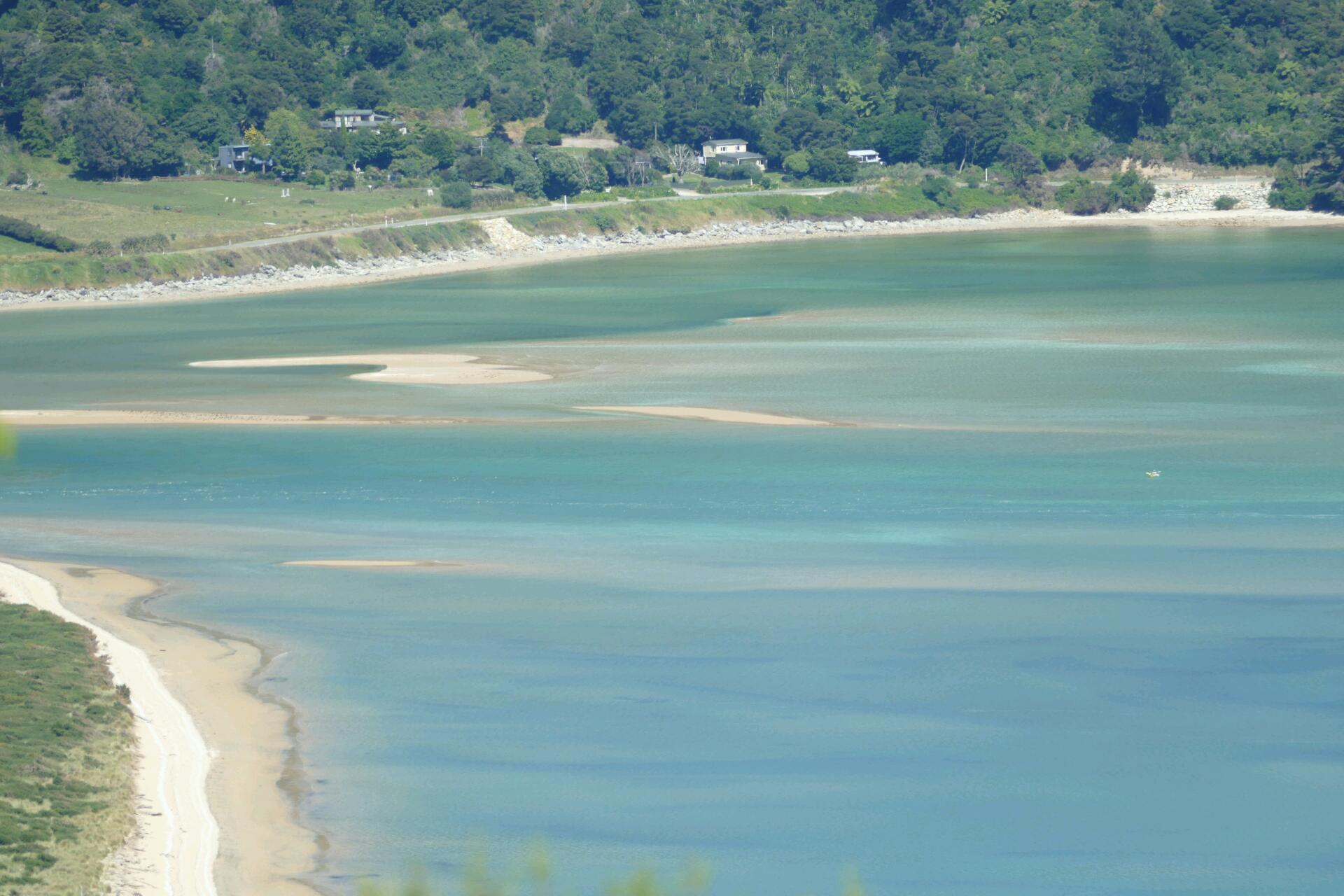 Nous commençons la journée par une marche de 5 heures de bon matin, de Totaranui à Awaroa. Le sentier longe la plage puis monte dans la forêt vierge. On marche entre mer et montagne, le chemin réservant d’assez belles vues sur le parc. Partout, on entend le chant des oiseaux qu’on a du mal à localiser, à peine entrecoupé par le bruit des vagues. Manu avait calculé que nous arriverions à temps pour traverser l’estuaire d’Awaroa, ce bras de mer ne pouvant être traversé qu’à marée basse. À Awaroa, il n’existe pas de voie terrestre autre que la traversée de l'estuaire. D'où la nécessité de regarder l'heure des marées pour ne pas être piégé. Le niveau est bas, l’eau monte parfois jusqu'aux Crocs. Nous traversons la moitié de la mangrove avant de faire demi-tour pour faire la pause pique-nique sur une plage. Les plages sont belles mais l’eau est toujours un peu fraîche. Il faut savourer avec les yeux. Dans l'après-midi,nous roulons jusqu'à Port Motueka pour passer la nuit.