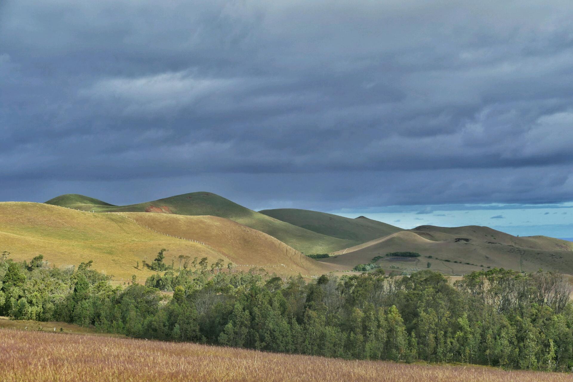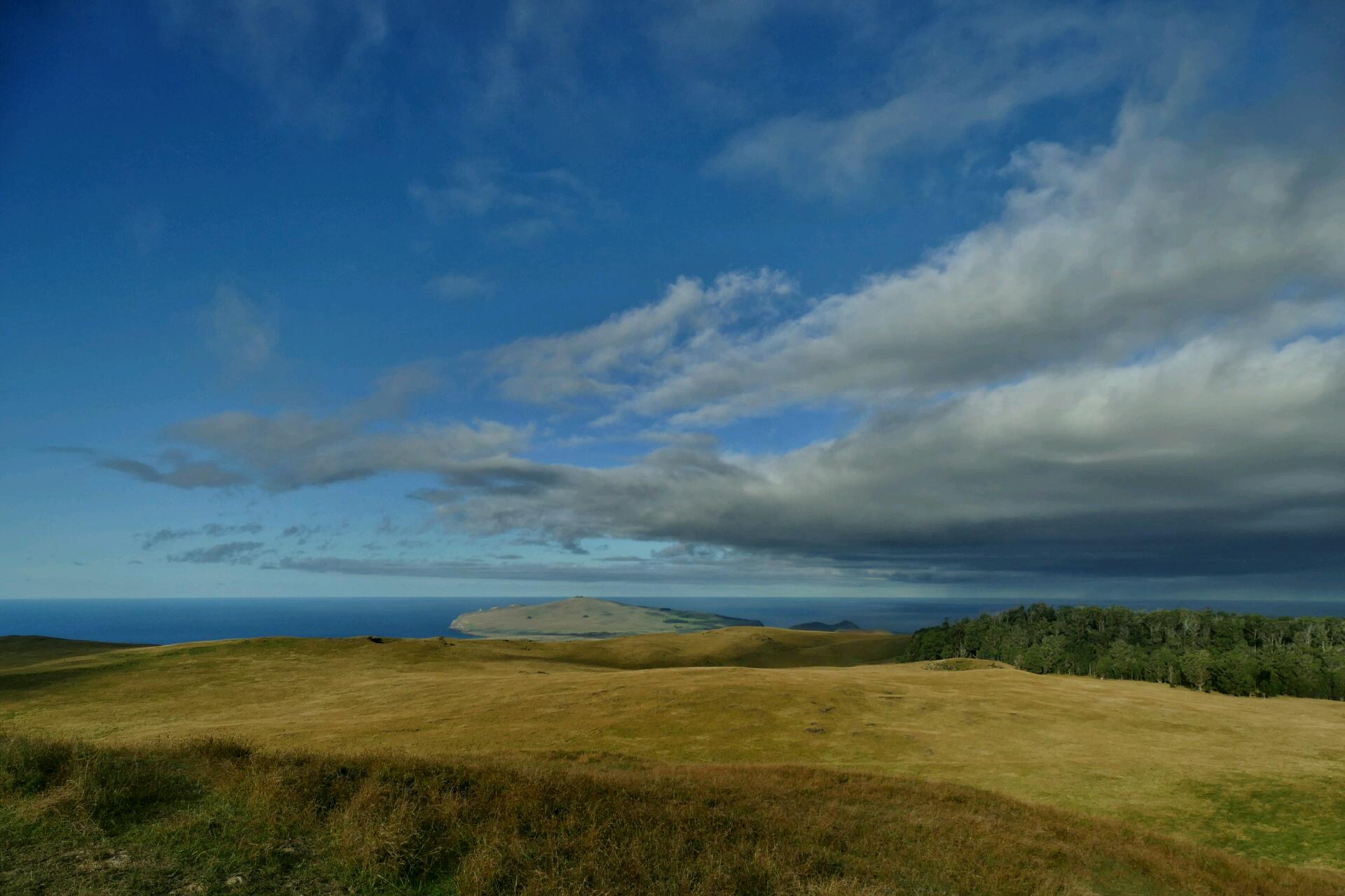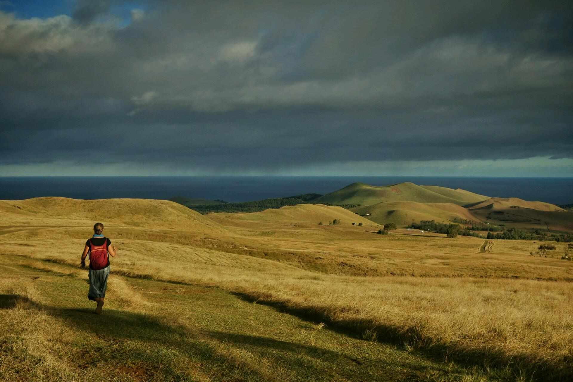 C’est aussi le point de départ du sentier qui gravit le volcan Terevaka, dont le sommet culmine à environ 500 mètres d'altitude. Il est le plus grand et le plus haut volcan de l'île. De par son altitude et son éloignement des autres terres émergées, il est en douzième position des sommets du monde ayant le plus grand isolement topographique. Nous montons à pied, en prenant bien soin des indications de Jenny concernant le chemin à suivre. Une petite montée doucette d’une heure nous promène à travers des paysages ruraux de volcans aux pentes herbeuses, la mer en toile de fond. Un mélange d'Auvergne, d'Irlande et de Nouvelle-Zélande.