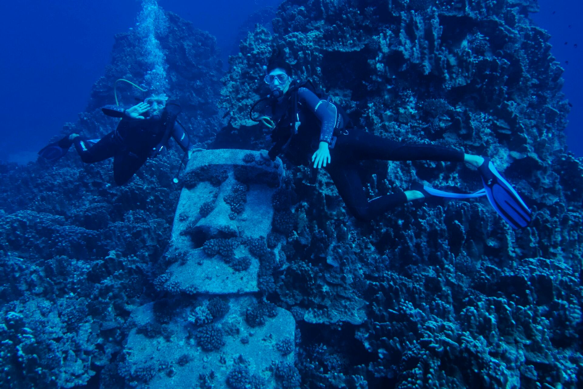 Ils sont pourtant toujours aussi motivés par l’idée d’aller sous l’eau ! Passionnés de plongée, il nous était difficile de refuser l’opportunité de plonger dans l’océan Pacifique sur le site du moaï immergé à 24 mètres, un des derniers mégalithes de l’île, mais contemporain celui-ci puisqu’il s’agit d’un vestige du film « Rapa Nui » volontairement coulé à l’issue du tournage. On s'équipe en combinaison intégrale et cagoule... ouah ça promet on va se cailler !!! Mais finalement l'eau doit être à 18° et finalement ce n’est pas si difficile. L'eau est d'un bleu très profond. Il n'y a pas trop de faune mais on a vu le moaï et une murène qui s’est laissée facilement approcher.