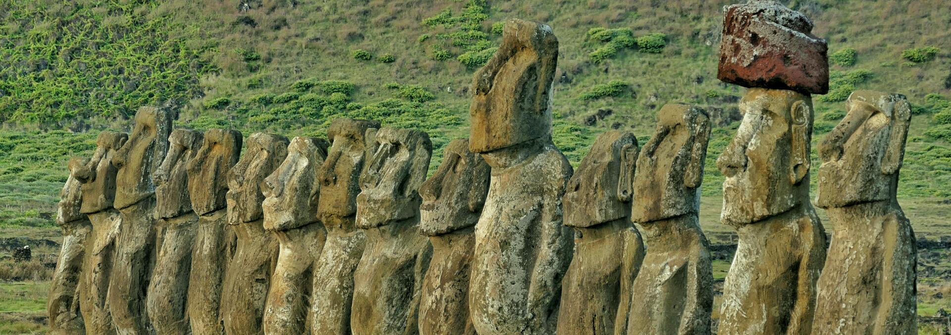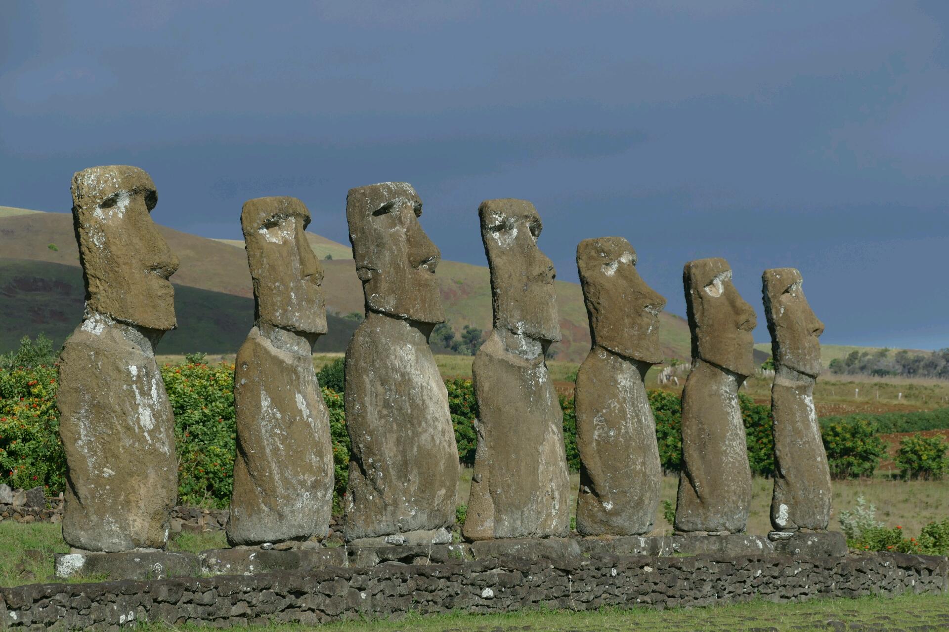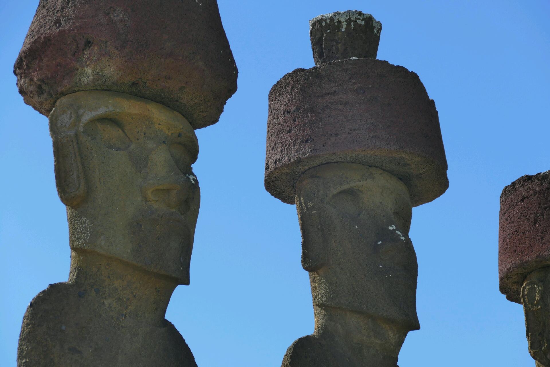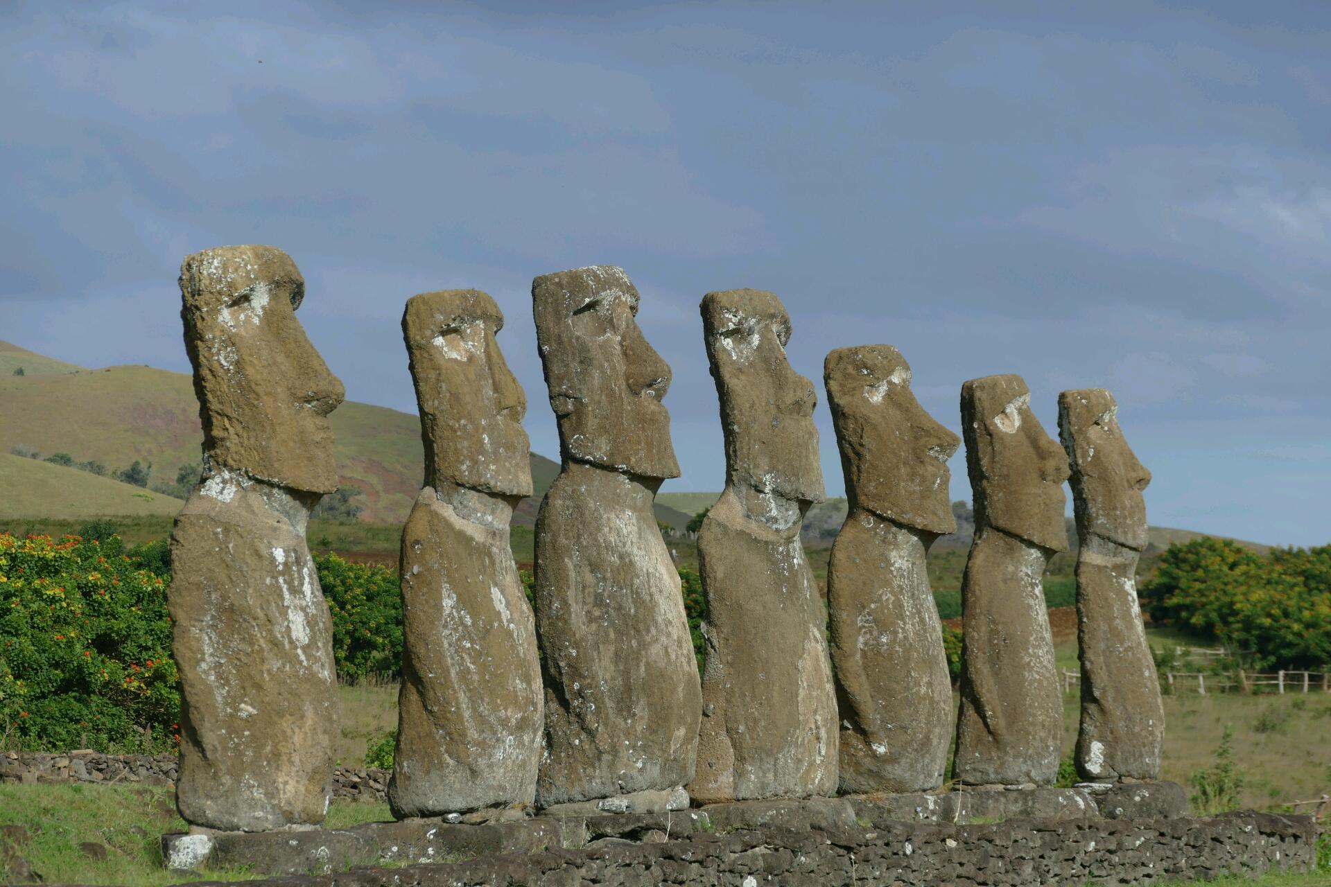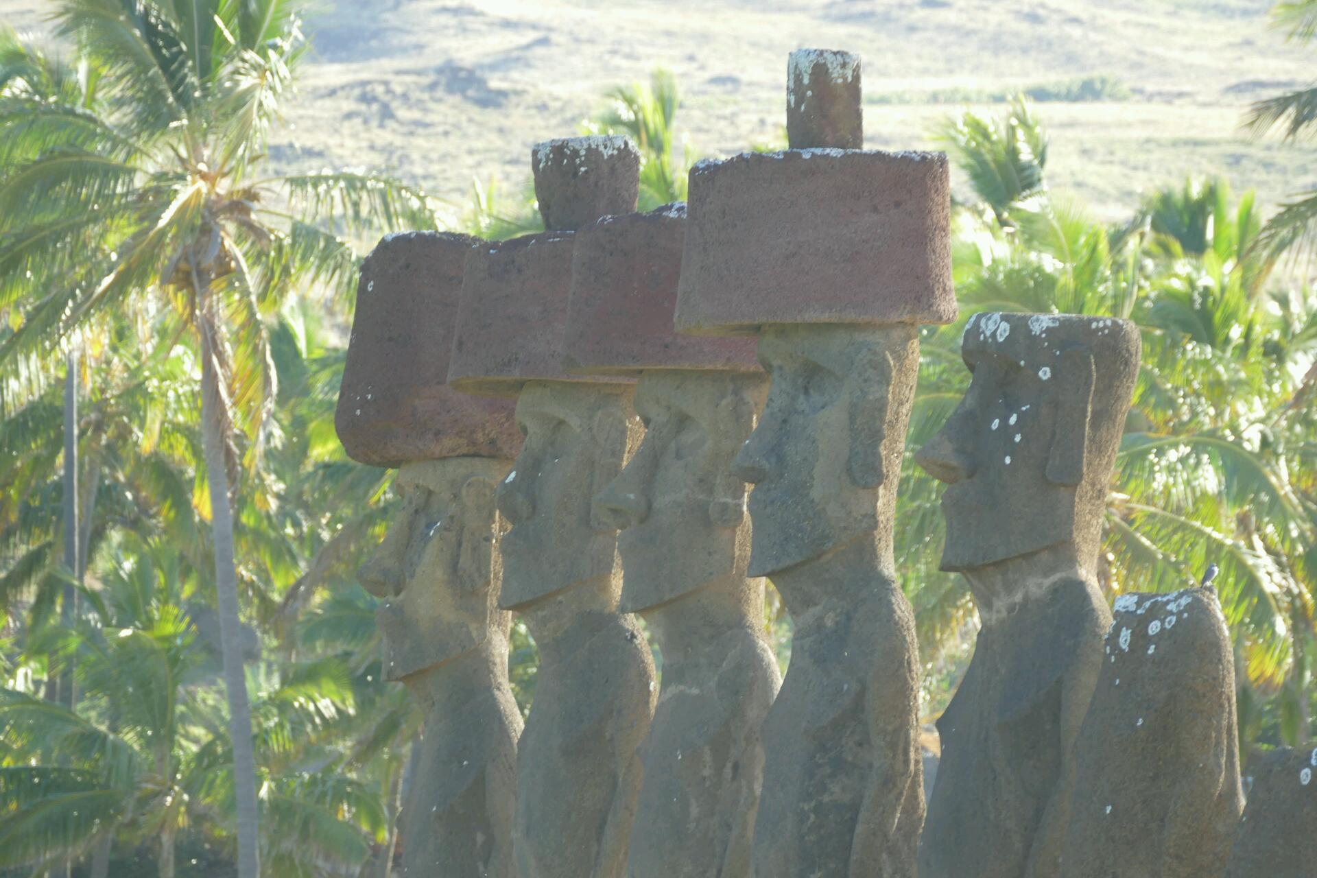 Sur ce bout de terre perdu en plein milieu de l’océan Pacifique, le tout est de décider par où commencer. Nous optons pour les moaï de Ahu Akivi. Ceux-là sont sept alignés sur la même plateforme et sont les seuls de l'île faisant face à l'océan. Ces 7 moaï représenteraient les sept premiers éclaireurs arrivés sur l'île depuis la Polynésie. Même si on avait déjà pu observer quelques-unes de ces statues en chemin, cette rangée de 7 moaï qui trônent fièrement nous impressionne davantage.