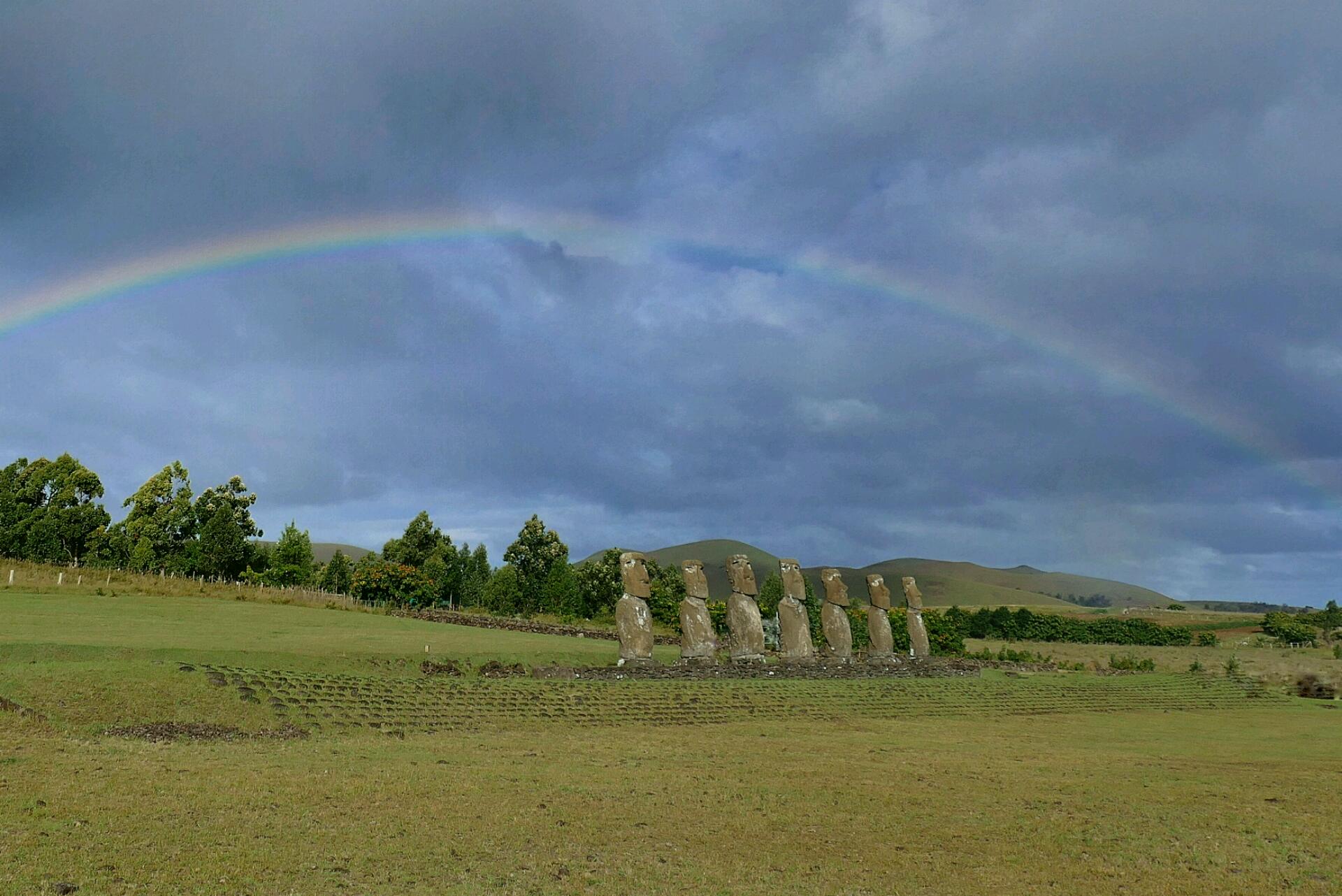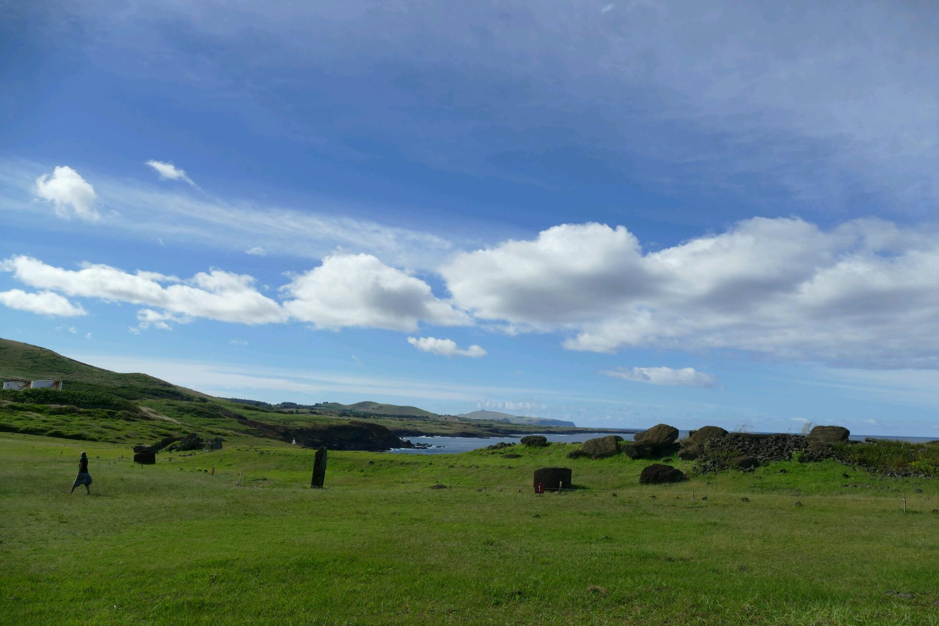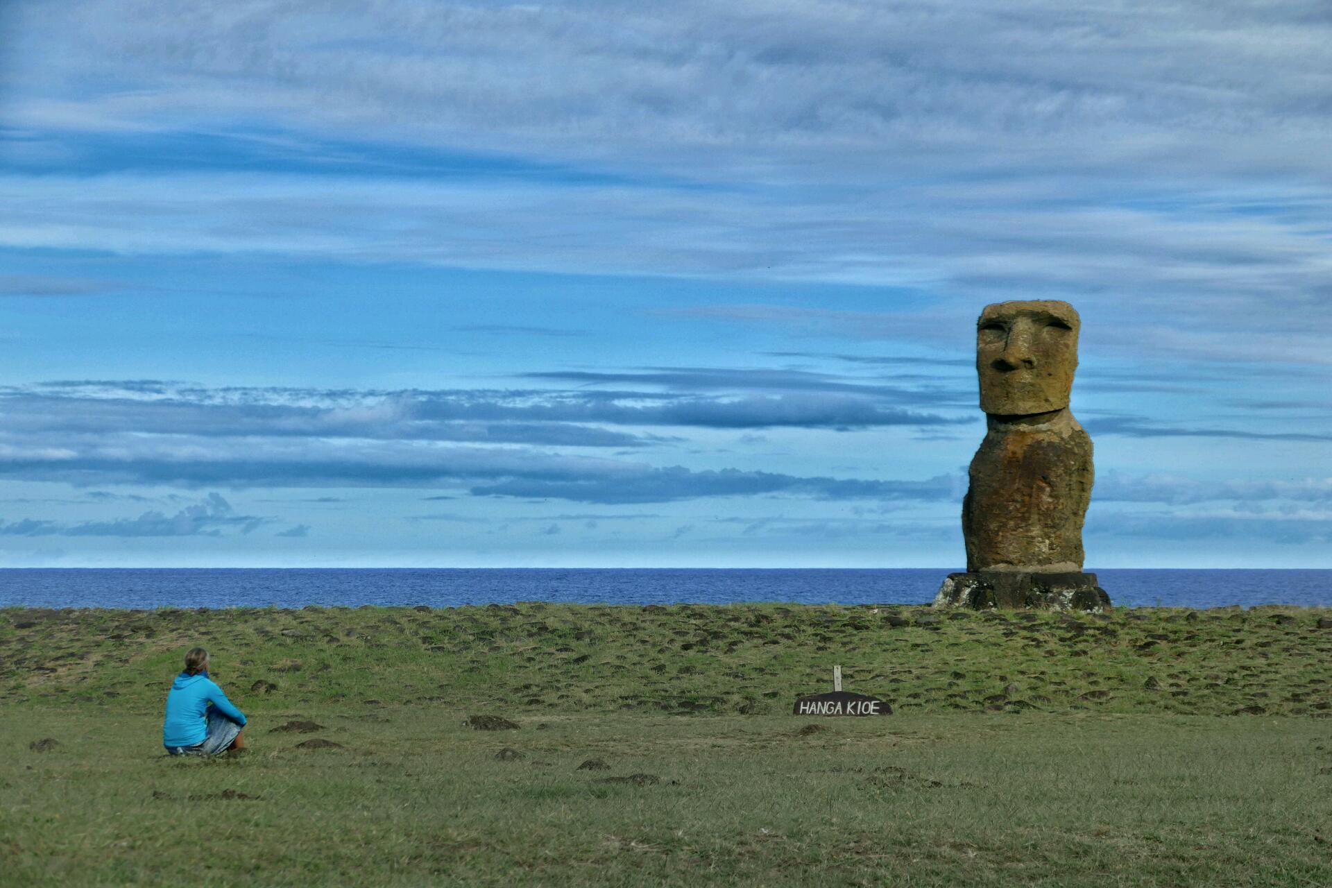 On y retourne quand même mais conformément aux prévisions, nous trouvons porte close. Nous croisons Flo et Jenny, attablés dans un restaurant devant une énorme assiette. Nous traversons le village, en direction de la mer : les maisons pascuanes aux murs recouverts de galets, aux petits murets en pierres de lave volcanique, à leur pied le vert des prairies, les chevaux en liberté qu'on croise sur les chemins aussi fréquemment que les chiens, et au loin, l'ahu Tahai. Nous arrivons avec émotion à la plateforme et il nous faut peu de temps pour apercevoir le premier des 887 moaï, ces statues mégalithiques emblématiques présentes sur l'île (le premier d'une longue série): le moaï Ko Te Riku.