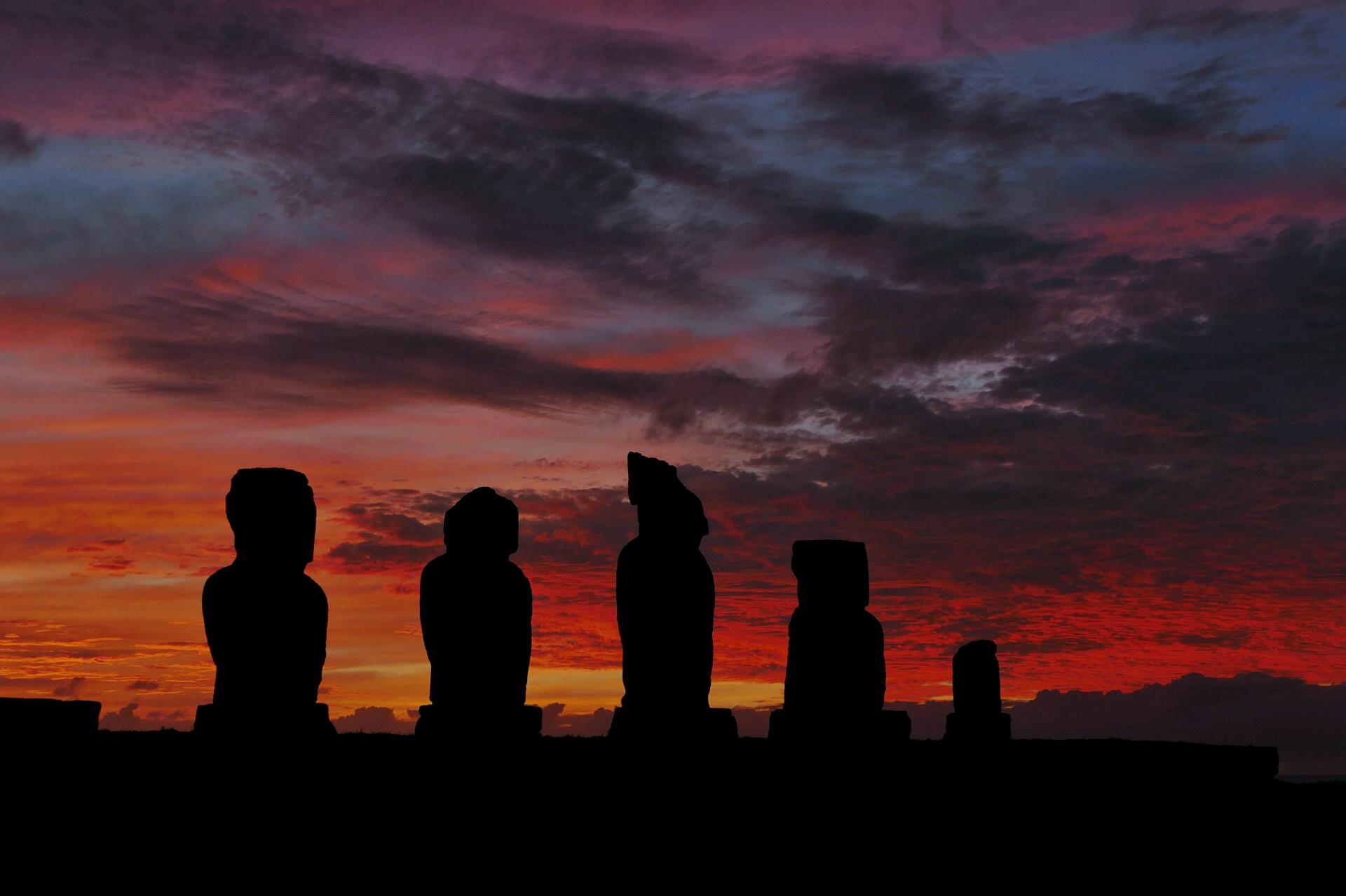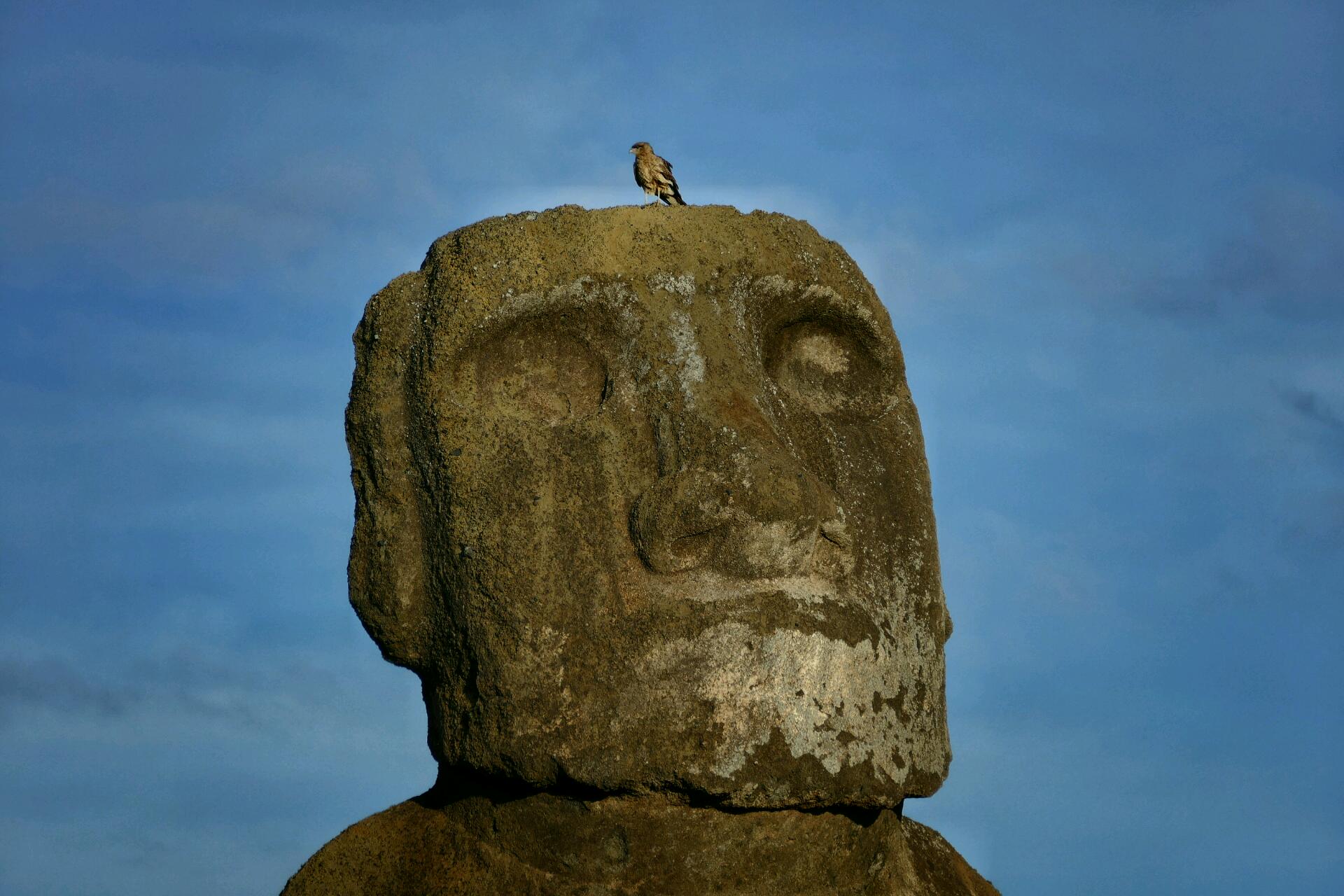 Nous prenons la route en sens contraire et nous croisons Flo et Jenny qui avaient finalement décidé de tenter leur chance aussi sur la plage d’Anakena. Il n’y a qu’une seule route, le plus souvent une piste, qui fait le tour de l'île en à peine 50 kilomètres, il est donc difficile de ne pas se croiser en permanence. Encore faut-il décider du sens dans lequel on tourne, mais avec Flo et Jenny, on a les mêmes besoins et les mêmes envies alors on se retrouve toujours, plusieurs fois par jour, sans même se donner rendez-vous ! Avertis de l’impossibilité de prendre des photos à cette heure-ci sur le site, nous fonçons en direction du site le plus fréquenté par les touristes, Ongariki suivis de près par les jeunes. Bien que nous arrivions 5 minutes avant la fermeture du site, Manu est autorisé à rentrer pour prendre quelques cliqués. Ensuite, nous nous installons par couple en deux points différents pour faire un Timelapse du coucher de soleil sur les moaï sous l’œil des faucons qui patrouillent le ciel.
