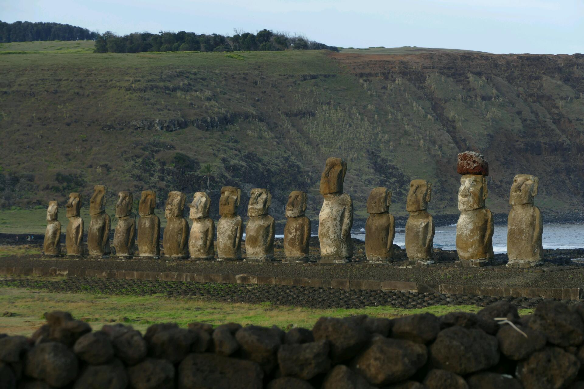 Il y a très peu de monde sur le site, Manu prend les moaï en photo sous tous les angles avant que nous foncions sur le site de la plus grande plateforme restaurée : les moaï de Ahu Tongariki (« Ahu » signifie « plateforme »), sur la côte est de l'île, près de la carrière. C’est probablement l’endroit que vous avez vu en photos dans les magazines… 15 moaï alignés sur un ahu de 200 mètres de long dont certains mesurant pratiquement 10 mètres de haut et dont un seul est muni de son « pukao », chignon rouge qui correspondrait à la coiffure des chefs de clans qui se teignaient les cheveux avec de la terre volcanique rouge (extraite à partir d'une source unique sur l'île, Puna Pau). Les autres pukaos sont à terre, à proximité, et n'ont pas été replacés sur les statues.