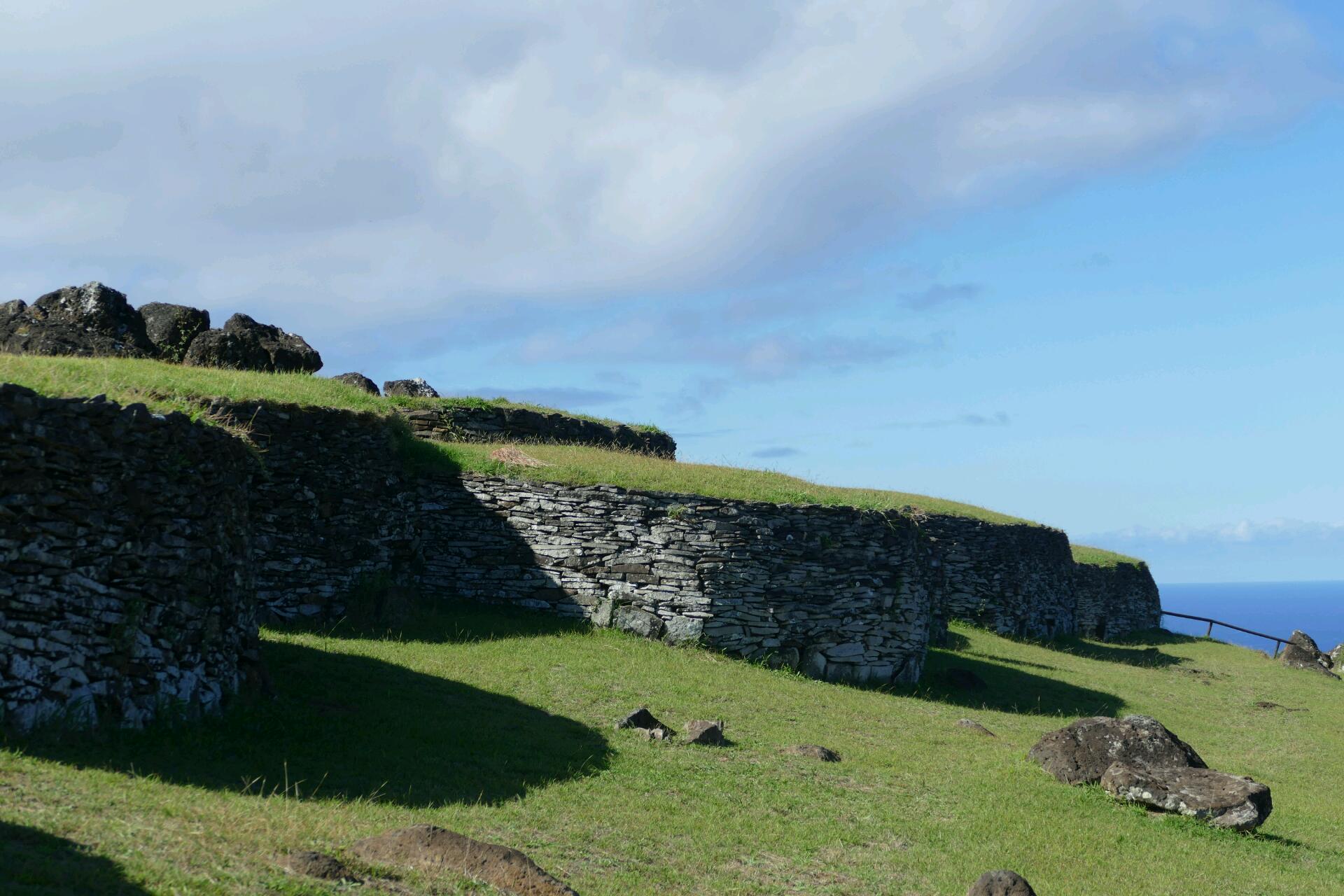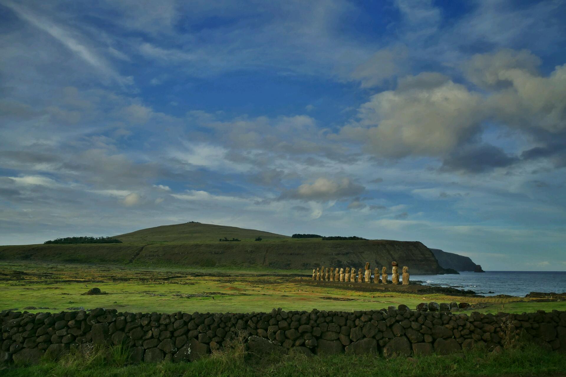 Le site est vraiment grandiose mais nous arrivons pour avoir les lumières de fin de journée et malheureusement, le site ferme à 17h30. On ne nous autorise à rentrer qu’en nous faisant promettre de ne rester que 15 minutes. Sur ce site, on voit bien une caractéristique des moaï : ils sont généralement placés dos à la mer. En fait, ils faisaient face au village, village de maisons-bateaux dont on devine ici les vestiges. Nous tenons notre promesse et nous sortons du site pour aller nous installer un peu plus loin, de l’autre côté du mur d’enceinte où nous assistons à un étonnant spectacle : les moaï s’éteignent un à un à cause de l’ombre de la colline.