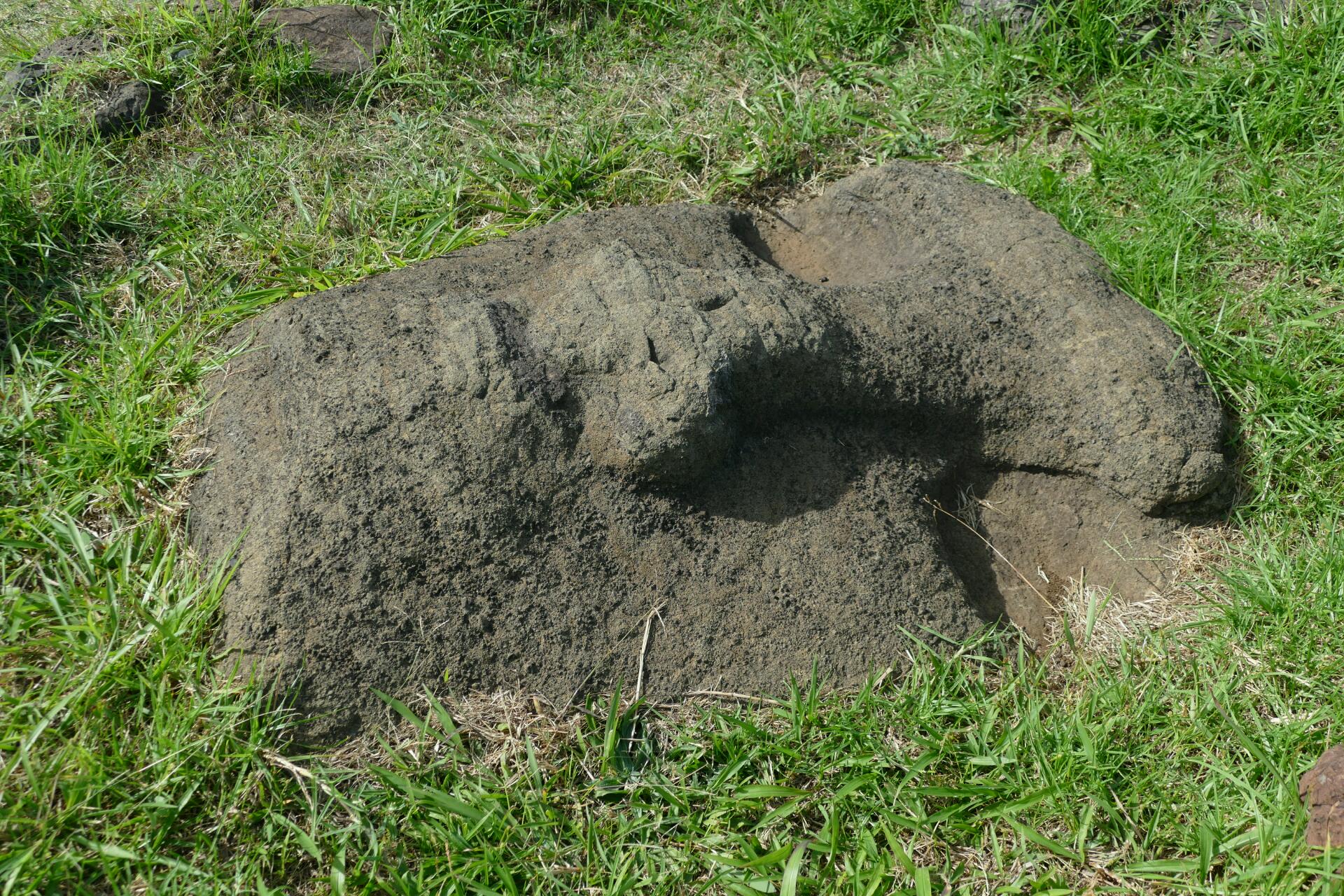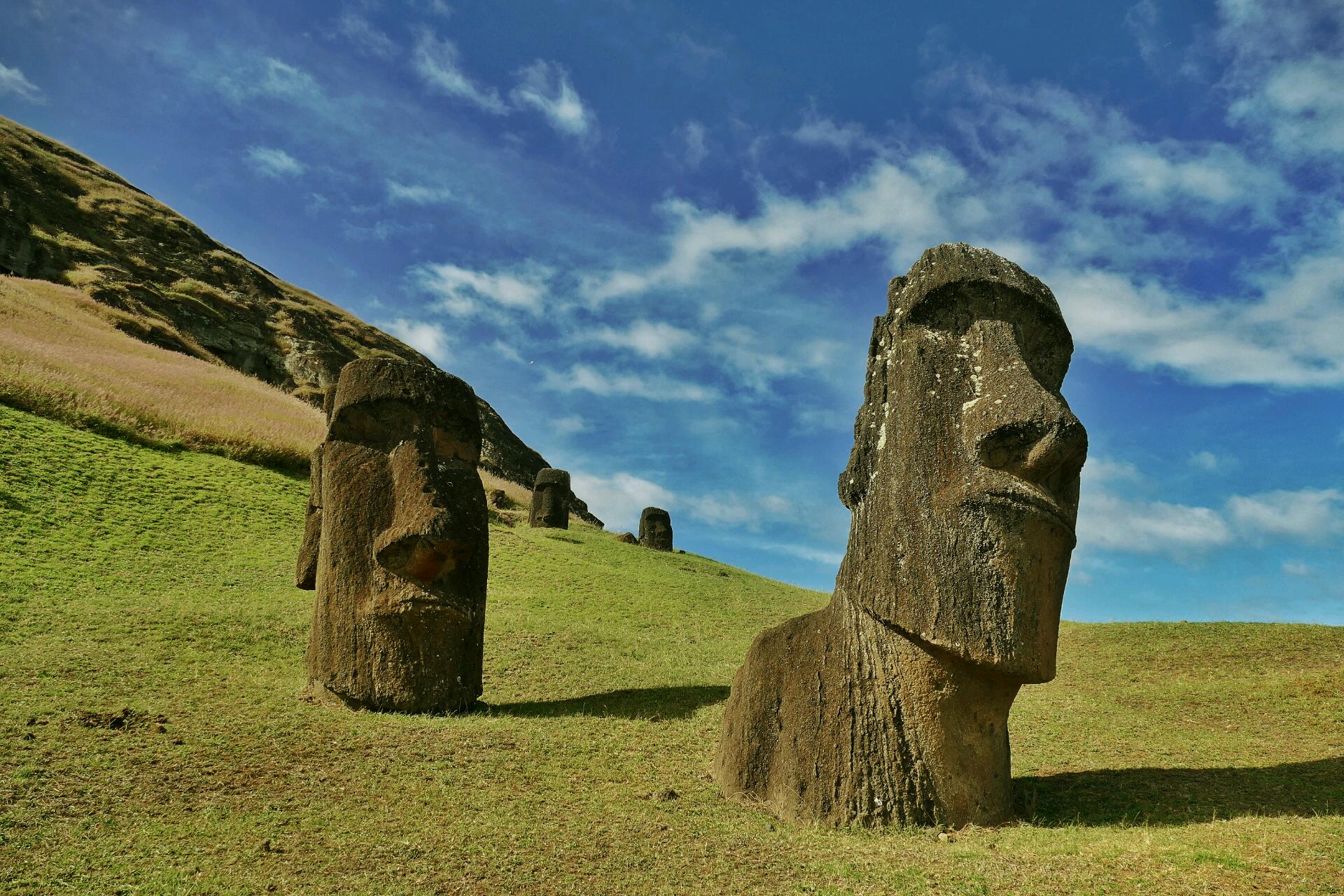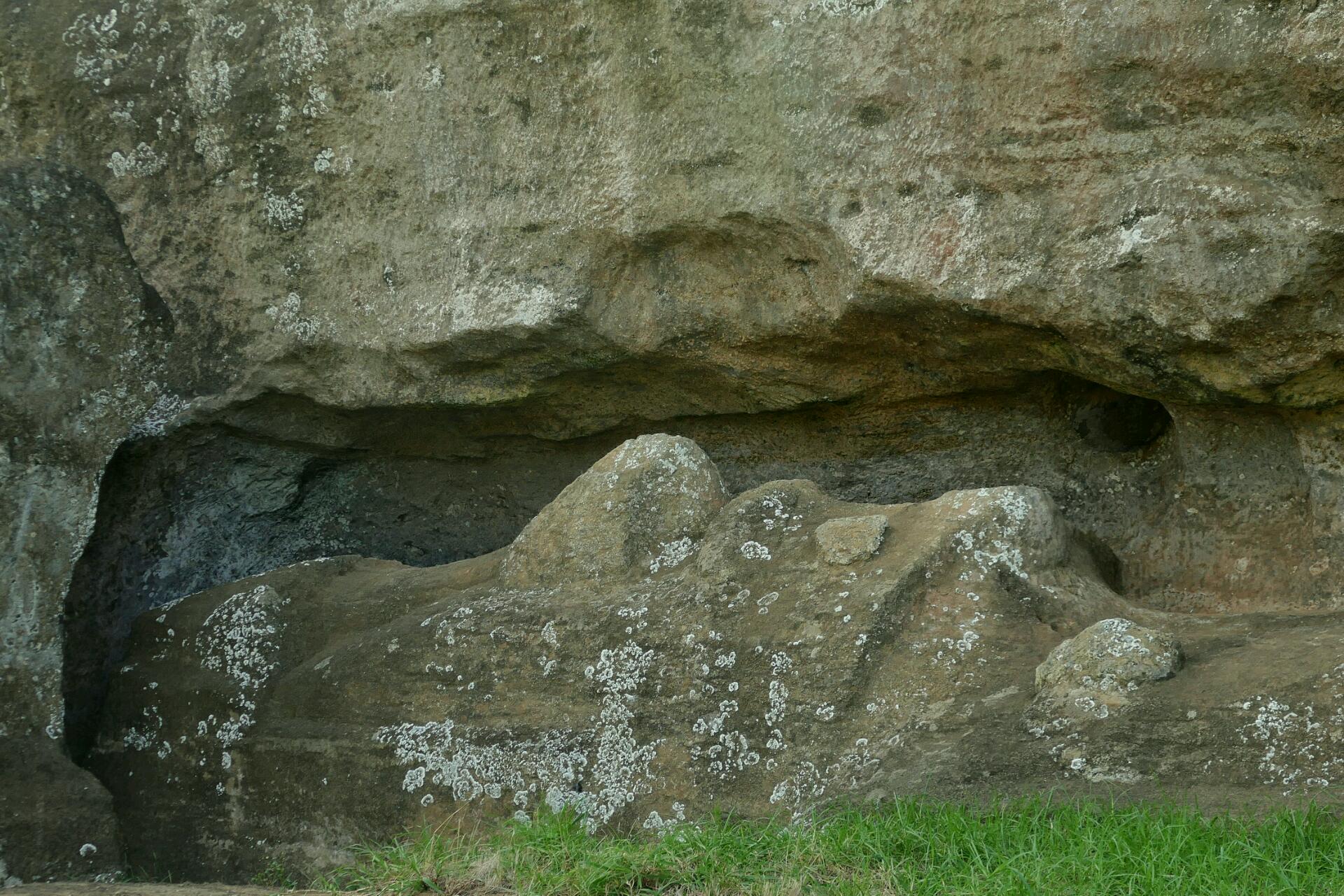 Nous apercevons Flo et Jenny en train de prendre des photos sur la route. Ils visent la même visite que nous. C’est donc tous les quatre que nous arrivons à la carrière Rano Ranaku où l’on peut comprendre et visualiser le processus de fabrication de quasiment tous les moaï, à même la roche (l'un mesurant jusqu'à 21 mètres de longueur). Les statues sont d’abord sculptées horizontalement, le visage vers le haut, dans la colline. On creusait une tranchée autour et en dessous du moaï pour que les ouvriers puissent travailler la pierre. La statue n’était solidaire de la roche que par le dos. Puis le moaï était « détaché » et transporté en bas de la colline où il était placé en position verticale pour que les sculpteurs puissent faire les finitions avant d’être transportés pendant des kilomètres pour être élevés sur les ahus (les plates formes sacrées). Partout, sur les versants du volcan, comme au sein de son cratère, on voit des centaines de moaï à différents stades de construction aux trois quarts ensevelis sous la terre au fil du temps. Nous sommes impressionnés : des bouts de nez sculptés, des yeux aux regards vides, des mentons proéminents qui dépassent, des moaï qui restent juste à extraire, d'autres à faire glisser pour les mettre debout, beaucoup déjà sur socle, enfouis dans la terre, de travers. On peut voir ceux qui n’ont pas été acheminés vers leurs emplacements définitifs. Comme si elle avait été figée dans la glace, la carrière est restée figée dans le temps.