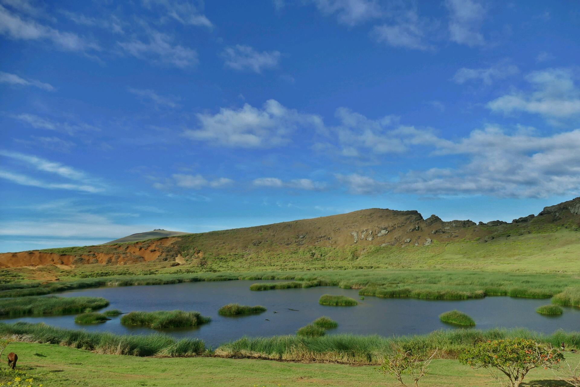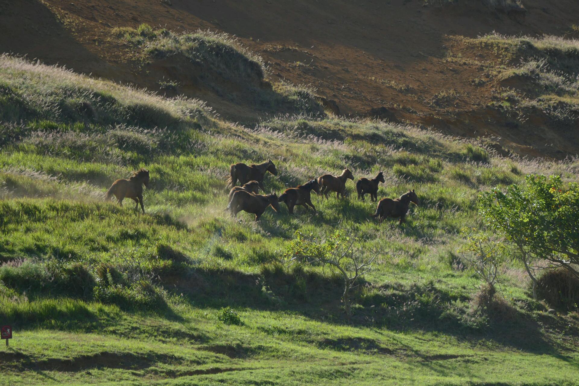Nous nous promenons à pied un long moment parmi la vingtaine de statues avant de nous rendre au sommet du volcan Rano Raraku. Ici, il y a un lac qui servait de réservoir d'eau pour les habitants avant qu’il n’y ait les canalisations qui la leur amènent désormais. Des chevaux sauvages se coursent dans la lumière du soleil. C’est vraiment un très beau spectacle.