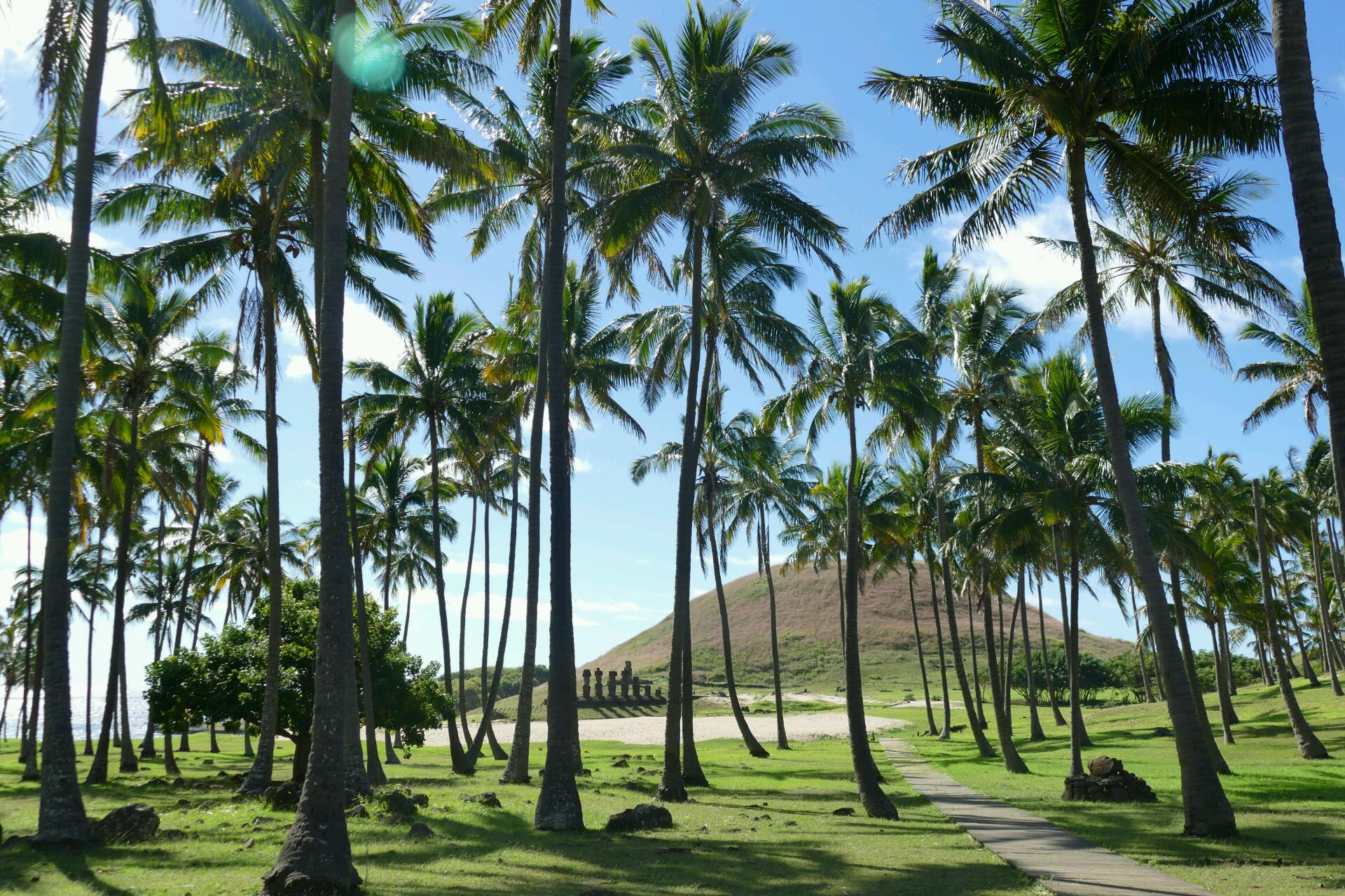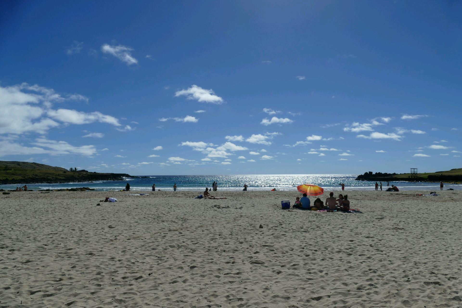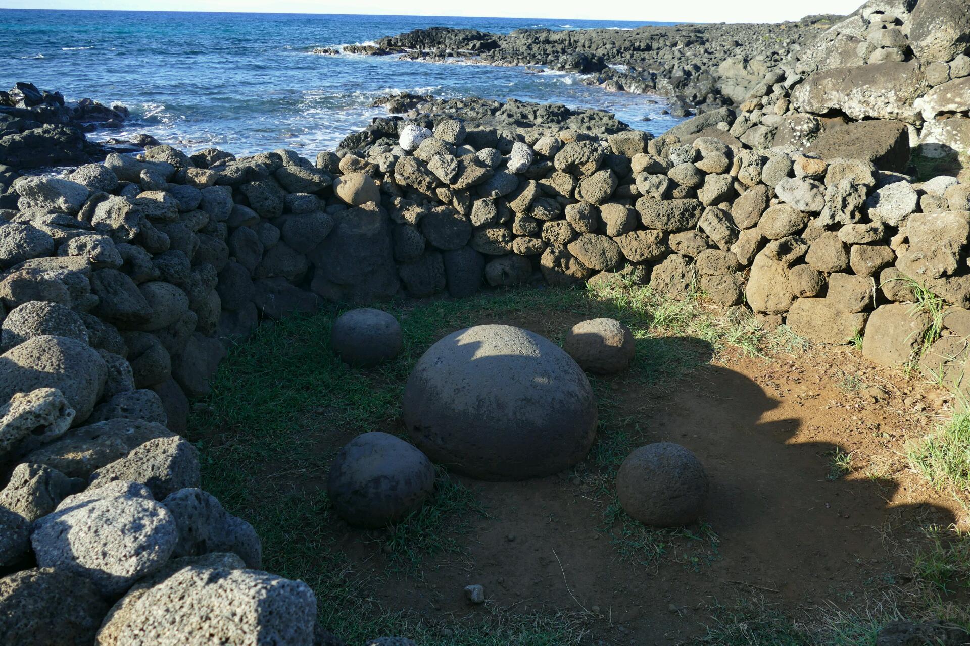 Nous décidons de continuer la route vers le nord. Nous retrouverons Flo et Jenny ce soir pour le coucher du soleil. Notre objectif est de rejoindre la plage d’Anakena, la seule plage de sable de l'île et la seule cocoteraie existante, par la route côtière. Sur la côte nord défilent les mêmes paysages rocheux et désertiques que sur la côte sud, seul l'ouest semble avoir été un tant soit peu épargné de la gigantesque déforestation nécessaire au transport des moaï glissant sur des rondins de bois. Nous nous arrêtons aux pétroglyphes et au nombril du monde (pierre ronde appelée « Te pito te o henua ») qui est, soi-disant, une pierre magnétique.