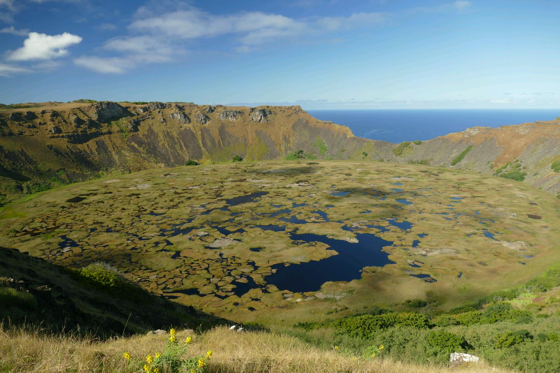 Le sommet du volcan Rano Kau se coiffe d'un cratère d'un diamètre de 1600 mètres où loge un lac profond de 200 mètres. Le site est vraiment très beau : des tâches bleues criblent le plancher tapissé d’herbes aquatiques jaunes, et un pan entier du cratère s’est effondré, laissant voir cet immense océan qui semble s’étendre à l’infini. Le microclimat de la lagune du Rano Kau a permis la prolifération d'une importante végétation, une flore unique et protégée, principalement composée de joncs et de totoras. Ces derniers forment une couche épaisse et résistante, capable de supporter le poids d'un homme. Jusqu'en 1973, les Pascuans venaient quotidiennement chercher de l'eau douce dans la lagune du Rano Kau.