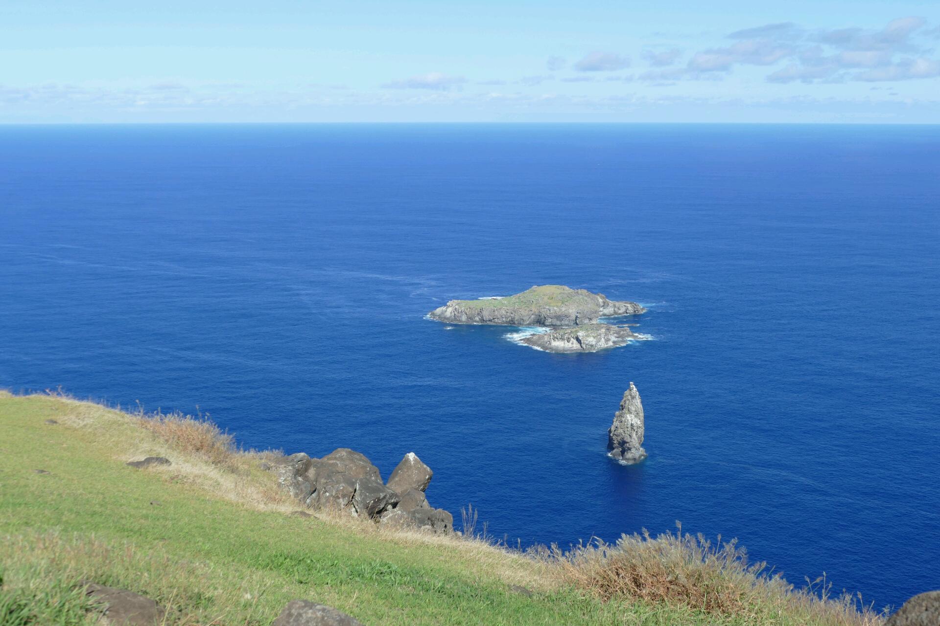L'autre point important, concernant l'île de Pâques, est le sentiment de solitude qu'elle procure. Du fait qu'il est possible de la parcourir en tout sens (de préférence en deux roues, c'est plus agréable) en passant par des routes et sentiers offrant une série de points de vue dans toutes les directions sur les horizons marins, du fait aussi qu'il est possible d'atteindre plusieurs des points culminants de l'île où le regard offre une vue sur la mer à 360° ou presque, on en vient insensiblement à prendre conscience du caractère insulaire du territoire, et de son isolement. L'île n'est en effet entourée que de petits îlots proches et de petite taille, et au plus loin que le regard porte (et il porte assurément loin, car certains points de vue sont hauts de plusieurs centaines de mètres), on ne voit que l'ample courbe de l'horizon océanique. Certes, un raisonnement simplement logique convaincrait aisément que l'impact visuel serait exactement le même si le continent voisin n'était qu'à 100 kilomètres de là, mais comme on sait par ailleurs que l'île est l'un des territoires les plus isolés du monde, et que ses influences se partagent à peu près également entre ses racines polynésiennes (Tahiti est à 4000 km) et son appartenance chilienne (Santiago est à 3500 km), on se laisse facilement bercer par ce sentiment de calme et de paix intérieure qui résulte de la conscience d'être à ce point coupé du monde, de son agitation et de ses tourments. C'est précisément le souvenir de cette précieuse atmosphère si particulière que je garderai de notre court passage chez les Rapa Nui.