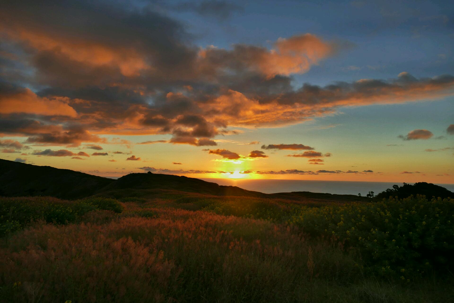Il faut dire que nous avons eu, cette fois, de la chance avec le temps. Comme beaucoup de terres émergées en plein milieu de l'océan, l'île de Pâques jouit de conditions météorologiques plutôt océaniques et pluvieuses, et il n'est pas rare que les dépressions s'y succèdent, provoquant une série de journées ou de semaines de brouillard ou de pluie. Non seulement avons-nous échappé à ce risque, mais nous avons bénéficié de températures idéales pour nos chevauchées en scooter, et surtout, nous avons été gratifiés à plusieurs reprises de ciels absolument exceptionnels, notamment pour les couchers de soleil.