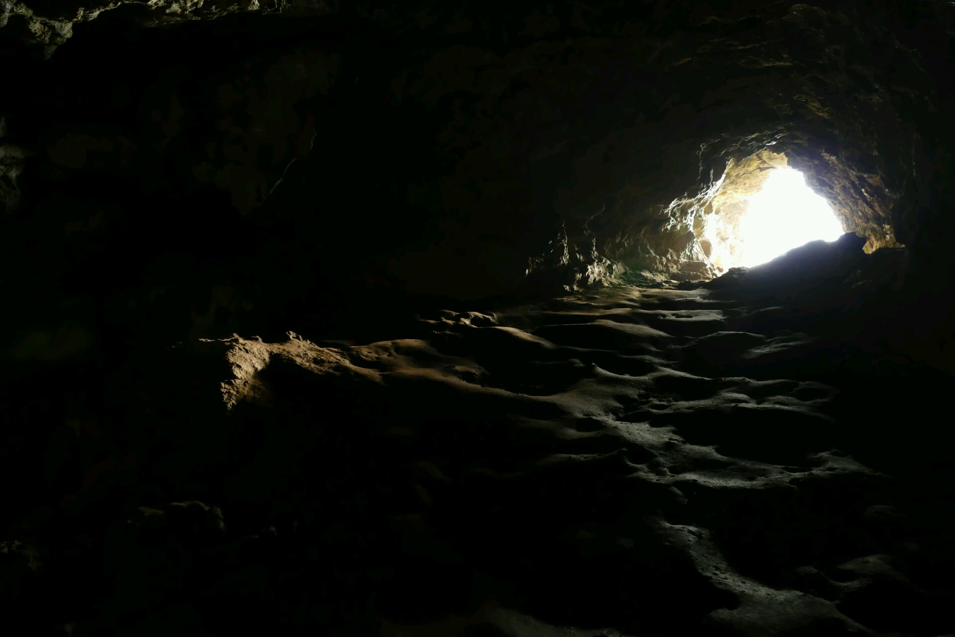 Nous décidons de marcher jusqu’à la grotte Ana te Pau avec Jenny alors que Flo va se reposer à leur logement. La grotte aux fenêtres sur la mer est un peu difficile à trouver car son entrée est un petit trou dans le sol … Nous cherchons un peu jusqu’à ce que quelqu’un nous indique l’entrée. Aidés de nos lampes de poches, nous descendons dans le sol, suivons un petit tunnel de lave et nous progressons pliés en deux jusqu’à arriver à une salle avec une ouverture sur la mer. D’ici, nous pouvons voir les vagues du Pacifique se déchaîner contre les parois des falaises.