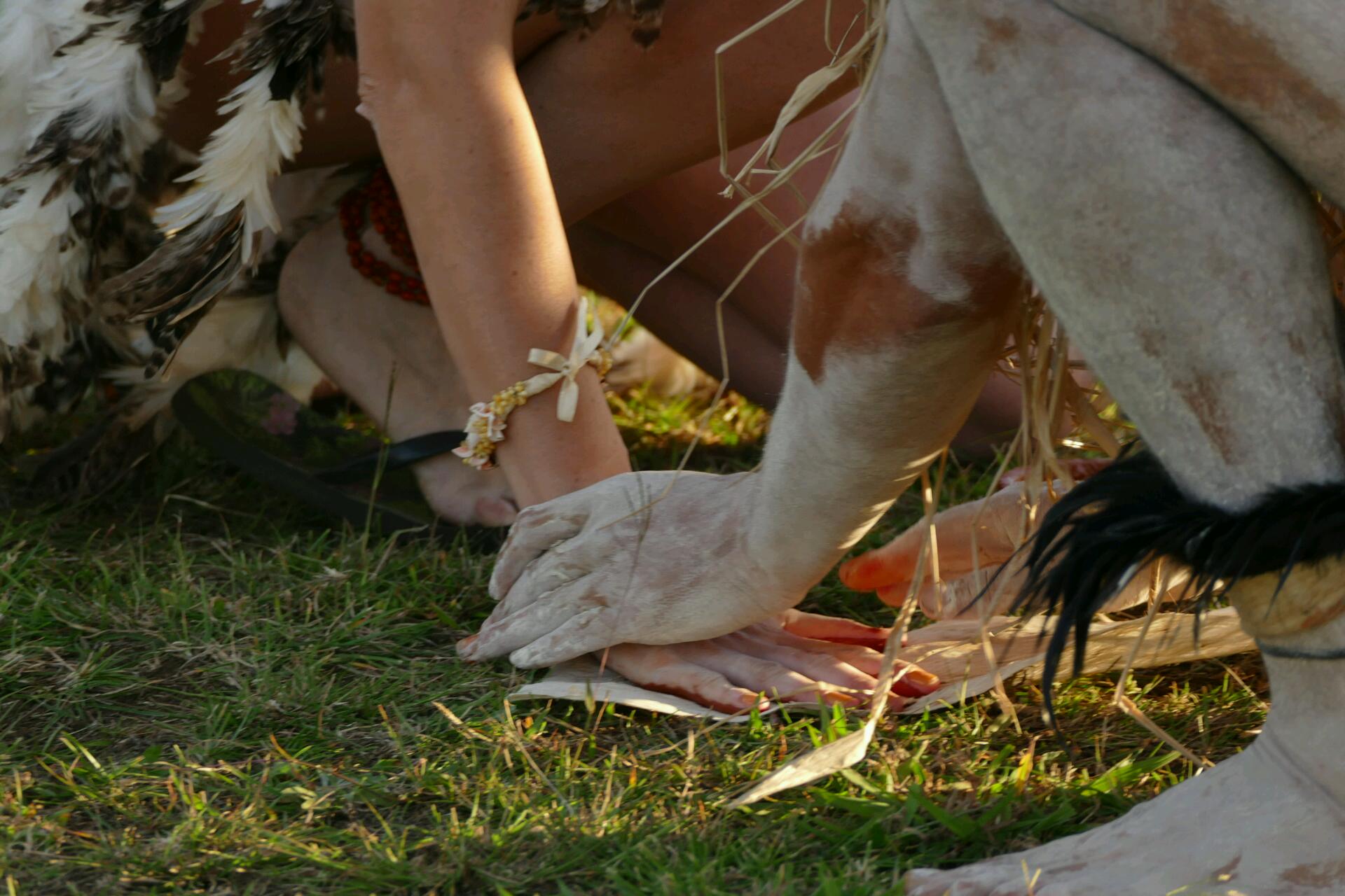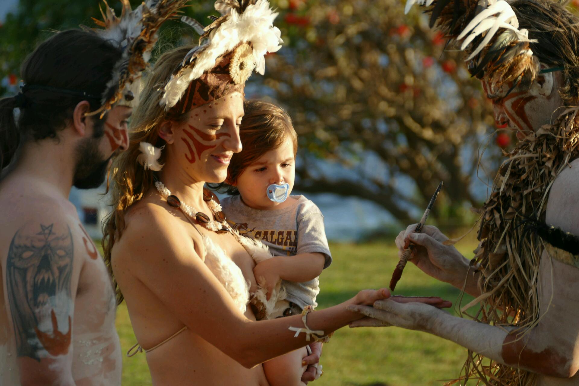 Alors que nous rentrons en longeant les côtes d’Hanga Roa, nous tombons sur un couple qui est en pleine cérémonie de mariage traditionnel polynésien. Je suis intriguée et je m’approche de cette cérémonie spectaculaire : le marié est à moitié nu, le corps peint avec un chapeau en plume, la mariée avec une tenue à base de plumes. Il s’agit probablement d’une prestation proposée aux touristes mais peu importe, je suis impressionnée.