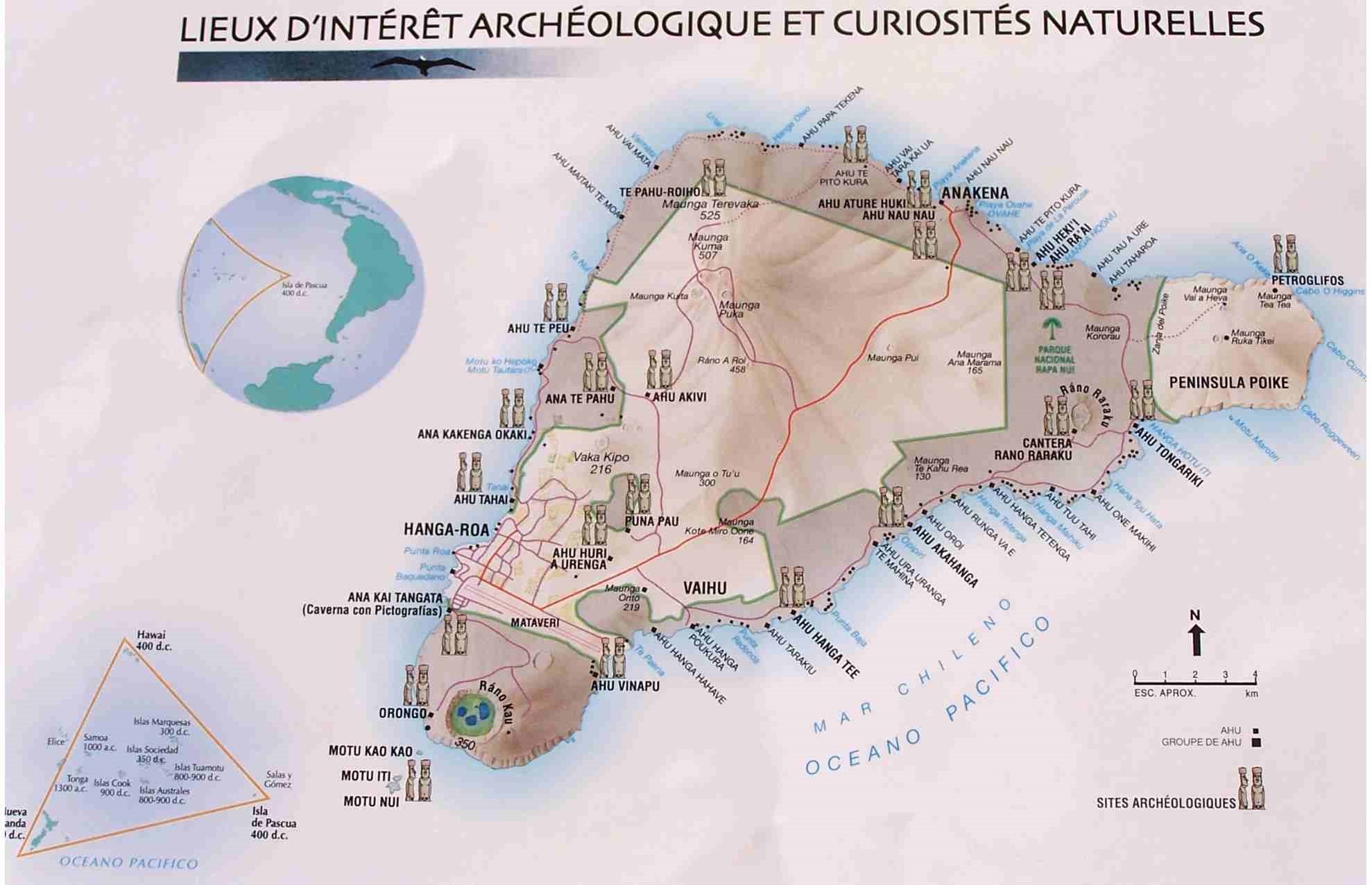 Nous voici donc à Rapa Nui (dans Latamgue pascuane) ou l'Ile de Pâques. C’est une île chilienne (même si les pascuans aimeraient être indépendants) d’environ 20 km de long sur 20 km de large. Elle se situe au Sud Est du Pacifique approximativement à 3700 km du Chili Santiago et 4000 km de Tahiti. L’ile habitée la plus proche est l’île de Pitcairn à plus de 2 000 km à l’ouest.
