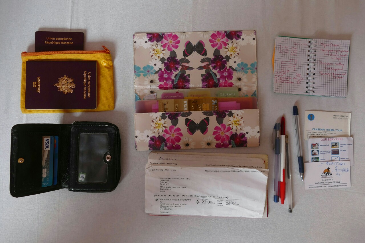 Evidemment, nous disposons aussi du minimum vital administratif toujours présent dans une banane ventrale ou une poche de pantalon: passeports munis des précieux visas, copie des billets d'avion, portemonnaie uniquement chargé de devises locales, quatre cartes bancaires, quelques cartes de visite glanées en route, quelques stylos et... un petit carnet de notes finalement acheté dans un bazar de Bishkek.
