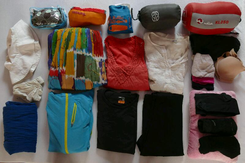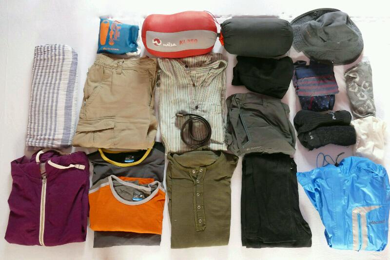 Pour économiser le poids au maximum, nous avons surtout réduit au maximum les pièces d'habillement. Pour cela, nous avons eu principalement recours aux vêtements techniques d'Icebreaker, donc nous avons chacun emporté plusieurs pièces superposables: T-shirts courts, hauts fins à manches longues, hauts plus épais, leggings... Les sous-vêtements ont été réduits au minimum, dans la mesure où ils devront de toute manière être lavés à chaque toilette. Pour les pays chauds, nous avons de sucroît pris un nombre (très limité) de vêtements de coton fin: une robe et une jupe multicolore pour Isabelle , une chemise chacun. Je n'ai pris qu'un pantalon de toile déperlant et un bermuda court; et chacun n'a emporté qu'un maillot de bain. Pour les pays froids, nous avons emporté chacun une doudoune légère composée exclusivement de duvet assez gonflant, soit un modèle Incredilite de Cumulus (325 g) pour Isabelle et un modèle Forclaz 700 de Décathlon (480 g) pour moi, ainsi qu'une veste de pluie (une Norrona Aero 60, 180 g pour Isabelle, et une Marmot Essence pour moi). Nous avons de surcroît chacun un indispensable chèche multi-usage (foulard, drap, châle, couvre-chef, serviette de plage... occasionnellement mouchoir!), et des bandanas ou chapeaux légers.