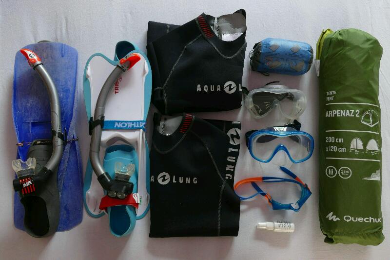 Concernant la catégorie "plongée", le nombre d'articles est plus limité (mais chacun est relativement encombrant). Les paires de palmes sont des modèles de base de Décathlon pour le snorkeling, qui présentent l'avantage d'être bien plus légers que les modèles plus sophistiqués ou spécialisés dans la plongée profonde; de plus, ce sont des modèles auxquels nous sommes habitués; s'ils manquent de puissance pour aller en profondeur, ils sont en revanche très adaptées aux sorties longues et au palmage le long des récifs. Les tubas sont des Air Purge d'Aqualung, réputés parmi les meilleurs modèles du marché. Les masques sont un Oceanic Shadow pour Isabelle, un modèle de base de Décathlon (mieux ajusté à mon visage) pour moi, les combinaisons des shorties Titanium d'Aqualung de seulement 1mm de néoprène (données à 560 grammes par le fabricant). Sur la photo figurent en outre notre tente (petit modèle Décathlon de 2,4 kg destinée en principe à un usage unique pour la trek de la traversée du Zanskar) et la moustiquaire (light nano de Seatosummit, données à 138 grammes seulement par le fabricant).