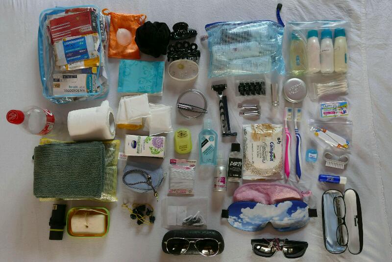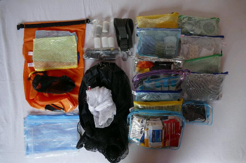 En matière d'hygiène/entretien/santé, nous faisons de substantielles économies de poids concernant la catégorie "serviette de toilette", limitée à un petit rectangle de tissu éponge en microfibre ultra-absorbant par personne, et la catégorie "savon-shampooing-déodorant-dentifrice", résumée à un seul exemplaire du savon du Dr Bronner (percé en son milieu pour pouvoir s'accrocher et sécher rapidement). Nous avons tout de même aussi du dentifrice solide et un autre savon (Lush), que nous utilisons moins souvent. Pour les cheveux, deux grosses pinces crabes et une dizaine de toutes petites, deux gros chouchous et quelques élastiques. Pour les problèmes féminins mensuels, une cup et quelques serviettes hygiéniques. Nous avons bien entendu une brosse à dents chacun, des brossettes, du fil dentaire, un rasoir mécanique et des lames, deux coupe-ongles (un s'est glissé là par erreur), une brosse à ongles, un miroir grossissant, une pince à épiler lumineuse, un stick pour les lèvres, un rouge lèvres (pour donner une petite touche de féminité quand même de temps en temps, des boules Quiès, un gel désinfectant pour les mains et des lingettes. Dans la catégorie des accessoires pratiques, nous avons un lot de 8 petits tendeurs, autant de mini-pinces et quelques bouts de fils métalliques qui nous permettent d'étendre le linge dans un bon nombre de circonstances. Nous avons aussi une boite de feuilles de lessive. Nous avons acheté en route un rouleau de papier toilette et 4 paquets de mouchoirs en papier. Dans une trousse avec des contenants autorisés en cabine, nous avons un ambre solaire, un lait après solaire, un anti-moustique tropical à l'icaridine et un autre au DEET. Dans l'autre trousse, ce ne sont que des anti-moustique car nous savons que nous allons en consommer beaucoup. Nous avons une paire de lunettes de soleil chacun et une paire de lunettes de vue. Enfin, nous transportons occasionnellement une petite bouteille vide permettant à Isabelle de faire pipi la nuit, quand on ne peut pas forcément sortir.