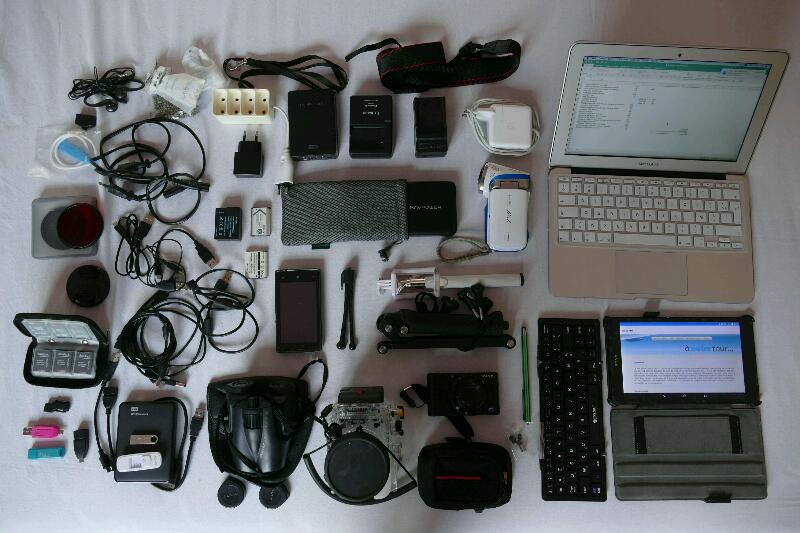 En matière d'équipement informatique, là encore, j'ai beaucoup réfléchi et comparé de nombreuses possibilités. Après des heures de délibération, mon choix s'est arrêté sur un Macbook Air 11 pouces (acheté d'occasion, dans un état proche du neuf, muni d'une coque rigide pas très pratique et personnalisé par un sticker photo), principalement pour des raisons de compromis poids/autonomie/capacité de montage vidéo. Cet équipement s'est trouvé doublé d'une tablette de petite taille (8 pouces) tournant sous Android, en l'occurrence une Xperia Z3 tablet, offrant un bon rapport performances/consommation/encombrement/prix. Pour des raisons pratiques, la tablette s'est trouvée munie d'une coque de protection, d'un clavier pliant séparé (eSync), et d'un stylet de précision (après un test d'usage, j'ai renoncé à prendre une souris ultra-légère). Ces équipements étant compatibles wifi, mais sans lecteur de carte 3G, la communication est assurée par un petit smartphone tournant sous Windows, en l'occurrence un Lumia 435 avec sa coque, qui accueille deux cartes Sim (une française, utile pour les communications d'urgence et les confirmations d'achats sur le web, et une locale qui permet de passer des appels ou de se connecter sur internet à moindre coût). Le téléphone ou la tablette pouvant permettre d'écouter de la musique, j'ai pris des écouteurs et un duplicateur de port mini-jack. Isabelle est aussi équipée d'une liseuse Kindle qui ne figure pas sur la photo. Nous avons également une petite paire de jumelles.