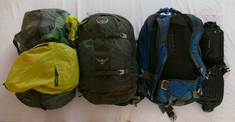 Les différents calculs et optimisations réalisées dans l'année précédant le voyage nous plaçaient à un seuil délicat d'environ 12 kilos par personne (hors tente). Dans ces conditions, il devenait tentant de tout passer en bagage à main, en particulier pour nous affranchir des risques de perte lors des trajets aériens avec connexions multiples, mais la condition pour cela était aussi que la dimension des bagages, et non seulement leur poids, soit conforme aux normes des compagnies aériennes. Nous avons alors découvert que ces normes, autrefois relativement standardisées, avaient nettement évolué ces dernières années, sous l'impulsion des compagnies low cost développant une politique commerciale tout à fait différente de celle des compagnies régulières. De ce fait, il devenait illusoire d'espérer passer en toute occasion nos bagages en cabine, et il convenait de s'orienter davantage vers un système modulable pouvant passer occasionnellement en bagage à main (en gros, sur les compagnies régulières), mais pouvant aussi se transformer en méthode mixte avec l'essentiel (le vital et le coûteux) en bagage à main et le reste en soute. Cette méthode supposait de recourir principalement à des sacs à dos de base de 40 litres pouvant presque toujours passer en cabine, mais aussi à des sacs annexes d'assez grande capacité, très légers et compactables, ayant pour vocation exclusive de servir de sacs de transport long (avion ou autocar) ou de petits sacs de randonnée à la journée. Pour équillibrer les poids, augmenter le caractère pratique et gagner un peu de place en cabine (et au détriment de l'esthétique d'ensemble), nous avons aussi opté pour des bananes ventrales d'assez grand volume. Dans tous les cas, nos bagages eux-mêmes sont extrêmement légers, ce qui a été l'une des conditions essentielles de notre gain de poids. Nos sacs de base (Osprey Farpoint 40) pèsent 1,44 kg et présentent de nombreux avantages pratiques, comme la possibilité de ranger les bretelles dans un compartiment dédié, un compartimentage très bien étudié (notamment pour la protection de l'ordinateur portable), et un excellent confort de portage. A l'usage, nous avons seulement regretté la trop petite taille du filet externe pour les bouteilles. Notre sac polochon supplémentaire est un Seatosummit Duffle Bag qui ne pèse que 80 grammes, nous donne quand il le faut jusqu'à 40 litres de contenance supplémentaire. A l'usage, nous l'avons cependant trouvé un peu fragile par rapport à la promesse du fabricant. Les bananes ventrales sont les plus vastes que nous avons pu trouver sur Amazon, elles présentent l'avantage de pouvoir accueillir facilement, en plus des différents documents de voyage et prote-monnaie, téléphone portable, appareil photo compact, Kindle et petite tablette avec clavier pliant. Les petits sacs de jour sont des modèles de base de chez Décathlon, au poids presque négligeable, très utiles à l'usage, mais assez peu résistants et particulièrement informes (on ne peut avoir une chose et son contraire).