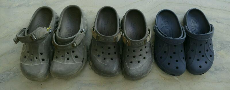 Et surtout, surtout, nous avons économisé un poids conséquent en ne partant qu'avec... une paire et demie de chaussures chacun, à savoir trois paires de "Crocs" pour nous deux (deux paires de Crocs d'un modèle résistant dit "off road", et une paire normale de taille intermédiaire). Pas de chaussures de randonnée, de sport ou de plage, tout en un. Nous espérons aller au bout de notre tour du monde avec ces seuls souliers, l'avenir dira si cette idée était vraisemblable ou non...
