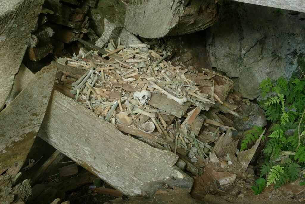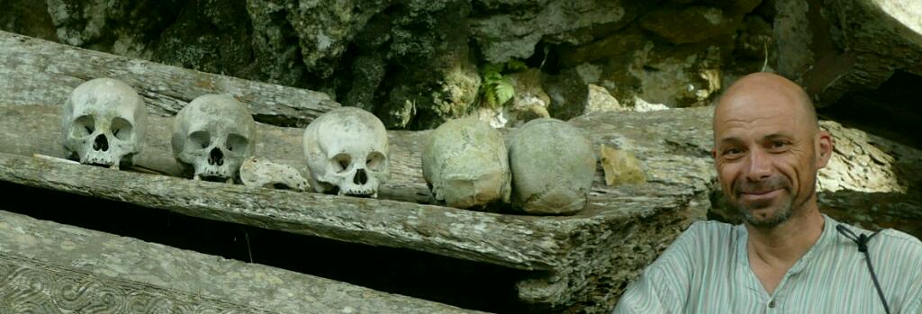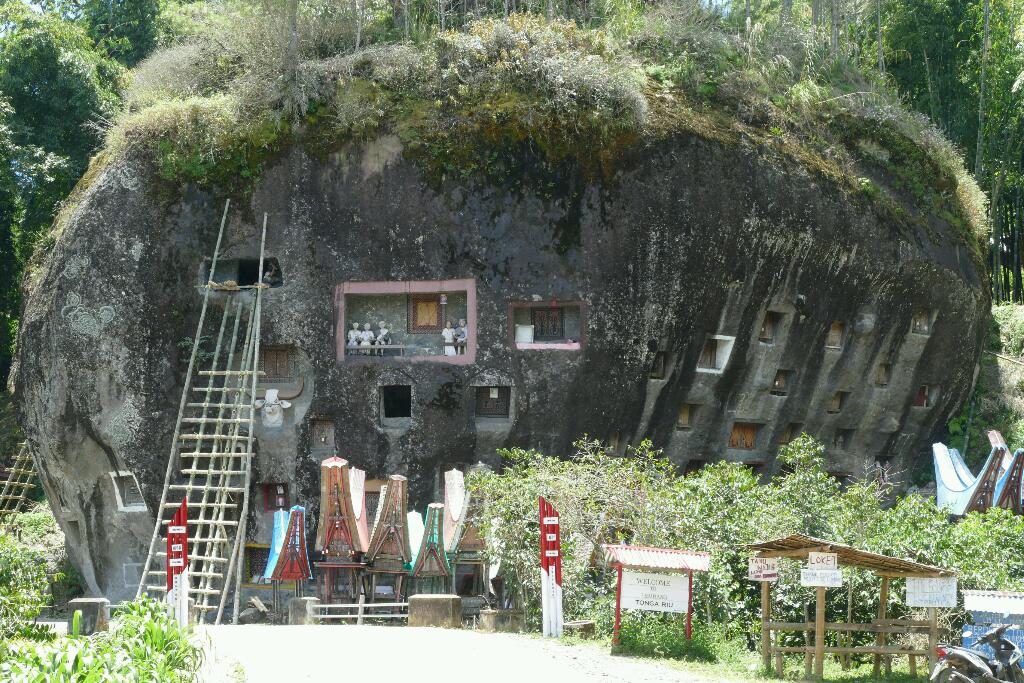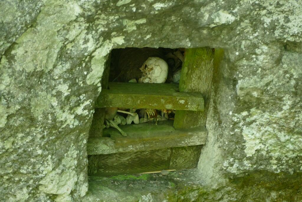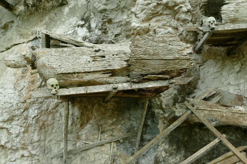 Nous les quittons pour marcher 15 minutes pour rejoindre le site funéraire. Ce qui est caché dans la majorité des civilisations ne l'est pas au pays Toraja, la Terre des Morts, où crânes et os humains font partie du paysage et de la vie. Les demeures funéraires sont creusées dans les falaises rocheuses. Nous y voyons donc d’anciens cercueils (dont certains encore bien conservés) accrochés à la falaise.