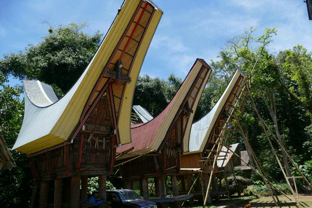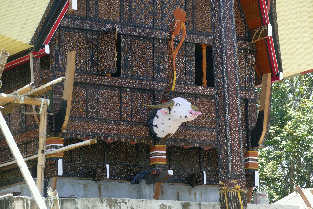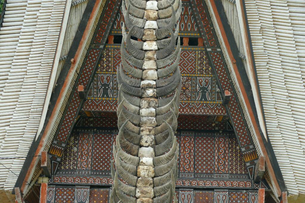 Les maisons des familles nobles sont ornées de têtes de buffles (une tête représente 15 animaux sacrifiés… certaines maisons en comptent jusqu’à une vingtaine par poteau !)