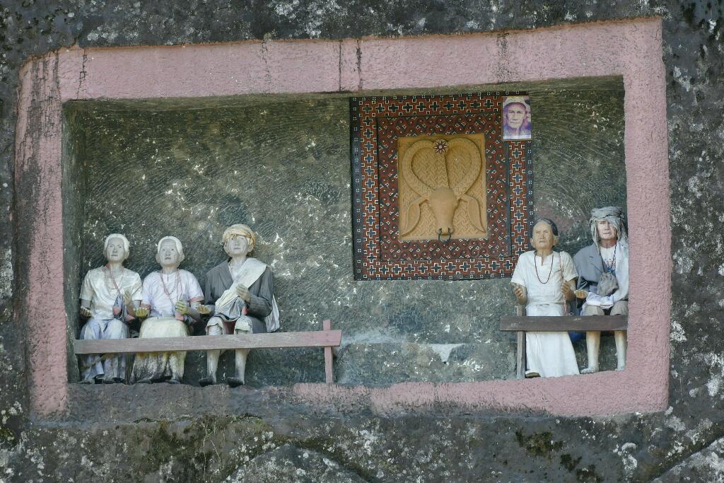 Plus loin, nous croiserons nos premiers tau tau. Devant ces tombeaux, se trouvent des balcons avec des effigies mortuaires qui bénissent les descendants du défunt en tendant la main en avant. Les tau tau, encore appelés les Morts au balcon, sont sculptés à l'effigie du défunt. Ils sont réservés aux familles nobles.
