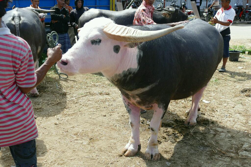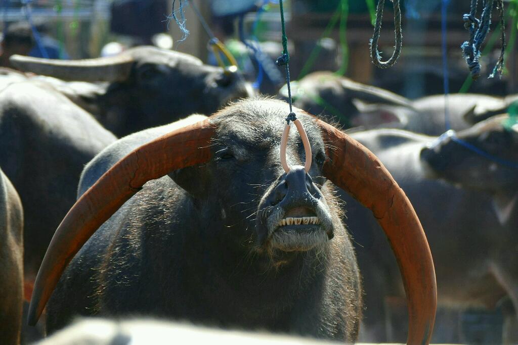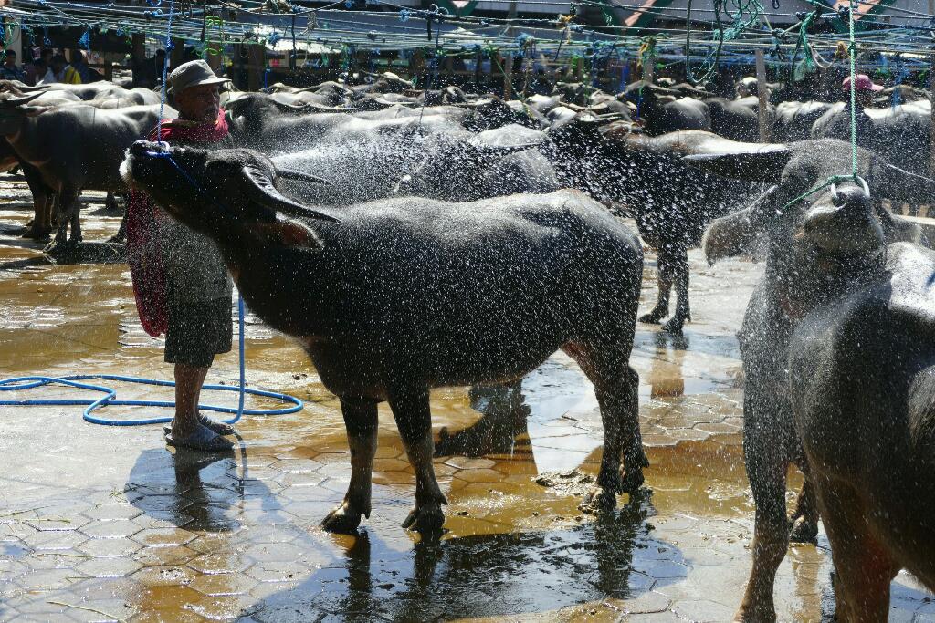 Nous partons à 9h00 pour une journée riche en découvertes culturelles. Nous commençons par le marché aux bestiaux de Bolu (banlieue de Rantepao) qui a lieu tous les 6 jours. Les habitants des villages de montagne descendent vendre et acheter des cochons et des buffles. Le buffle est un animal sacré pour les Torajas. Il est sacrifié en nombre important lors des cérémonies d’enterrement (la moyenne est d’une vingtaine d’animaux par cérémonie); en effet, les Torajas croient que les buffles sacrifiés serviront de monture aux défunt pour atteindre l’autre monde (Puyaou « paradis toraja »). Un buffle ordinaire coûte au minimum 30 millions de roupies (2 000 €) et un buffle extraordinaire (rose tâcheté à grosse encolure) peut monter à 1 milliard de roupies (65 000 €). Cela représente une fortune pour les familles qui consacrent plus de la moitié de leur salaire à la préparation des cérémonies funéraires. Une fois acheté, le buffle est chouchouté jusqu’à son sacrifice, il ne travaille pas, est nourri avec la meilleure herbe (qui coûte aussi très cher à son propriétaire car les pâturages sont rares), lavé, bichonné, promené…