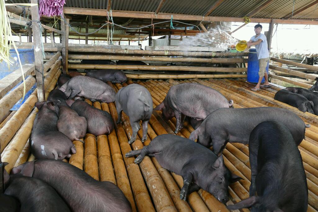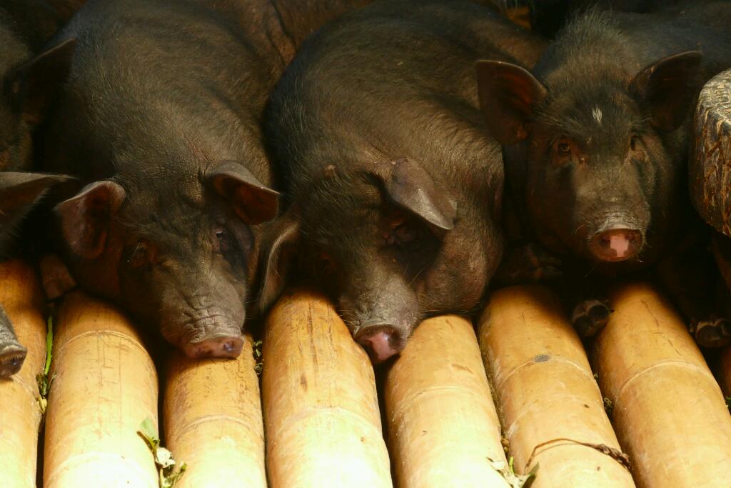 Le marché aux cochons, sous un immense hangar, est assez surréaliste. Les cochons noirs et rose sont typiquement toraja et beaucoup vont finir en sacrifice à des funérailles torajas. Les bêtes sont allongées et fermement attachées à leur support en bambou. Les petits cochonnets sont ficelés dans des sacs et transportés en bandoulière par les heureux propriétaires. Ce marché est très bruyant : ça hurle, ça couine et ça discute ferme.