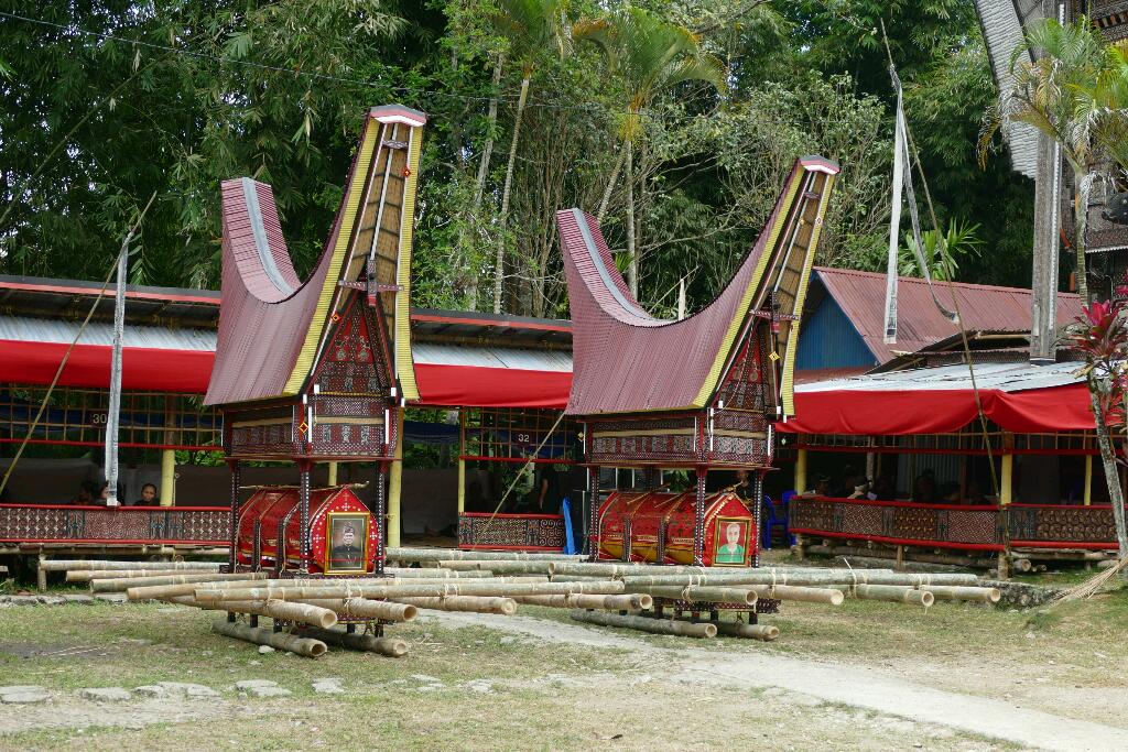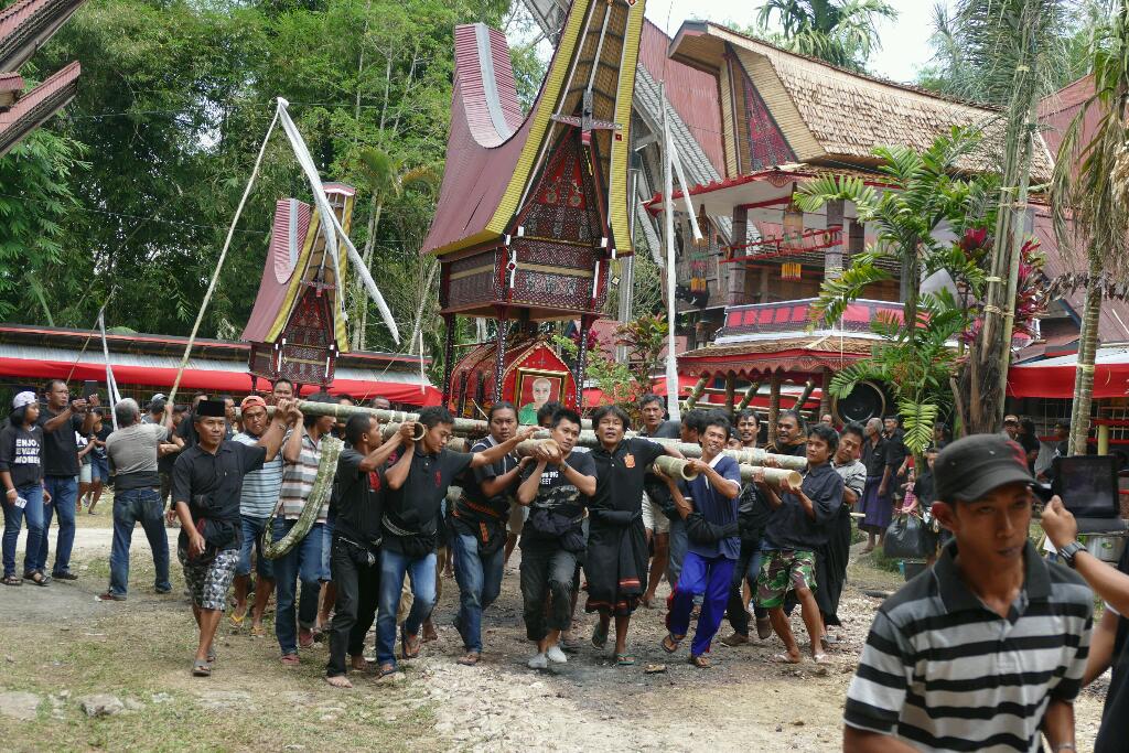 Une cérémonie dure plusieurs jours. Le premier jour, on égorge des cochons à tour de bras. La famille et les voisins arrivent peu à peu, la plupart amène un cochon ou un buffle. Ce n’est pas un cadeau gratuit… en pays Toraja, il existe un système de dettes : si une personne amène un animal en « cadeau » lors d’une cérémonie, la famille devra lui rendre la pareille lors d’autres funérailles sous peine d’être bannie. Des fonctionnaires de l’Etat tiennent le compte des dettes… et des animaux sacrifiés : en effet, la Région touche une taxe sur chaque sacrifice… sa principale ressource, on comprend que l’Etat encourage le maintien des traditions ! Ce jour là aussi, on boit du café avec le mort, ses proches et ses invités et on déguste des gâteaux. Un présentateur égrène dans son micro continuellement les noms des invités qui arrivent ainsi que les offrandes qu’ils apportent. Le deuxième jour (c’est le plus sanglant) est consacré au sacrifice de buffles qui sont égorgés un par un. Nous, nous arrivons pour la mise en tombeau. Nous nous installons sous une maison traditionnelle, parmi la centaine d’invités pour assister à la cérémonie. On a construit aussi des maisons provisoires en bambou qui servent aux invités à observer les sacrifices de buffles et cochons, se reposer, se protéger du soleil ou de la pluie.