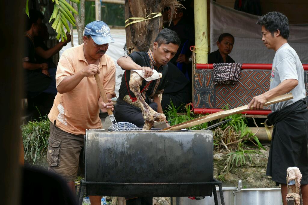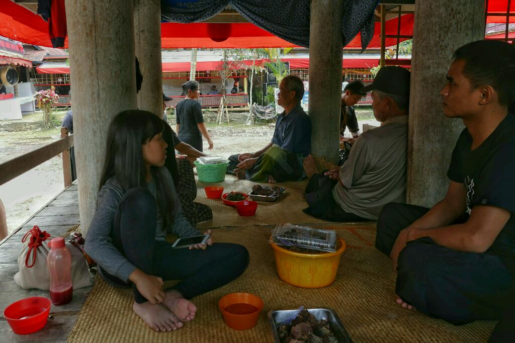 Les petits-enfants des défunts chantent deux chants, plusieurs éloges funéraires sont prononcés par les proches pendant que buffles et cochons mijotent.