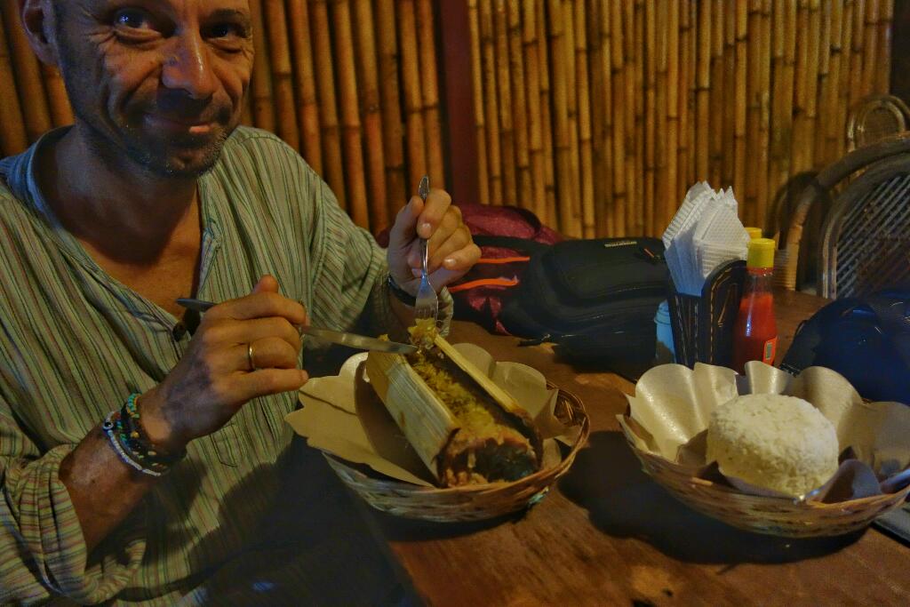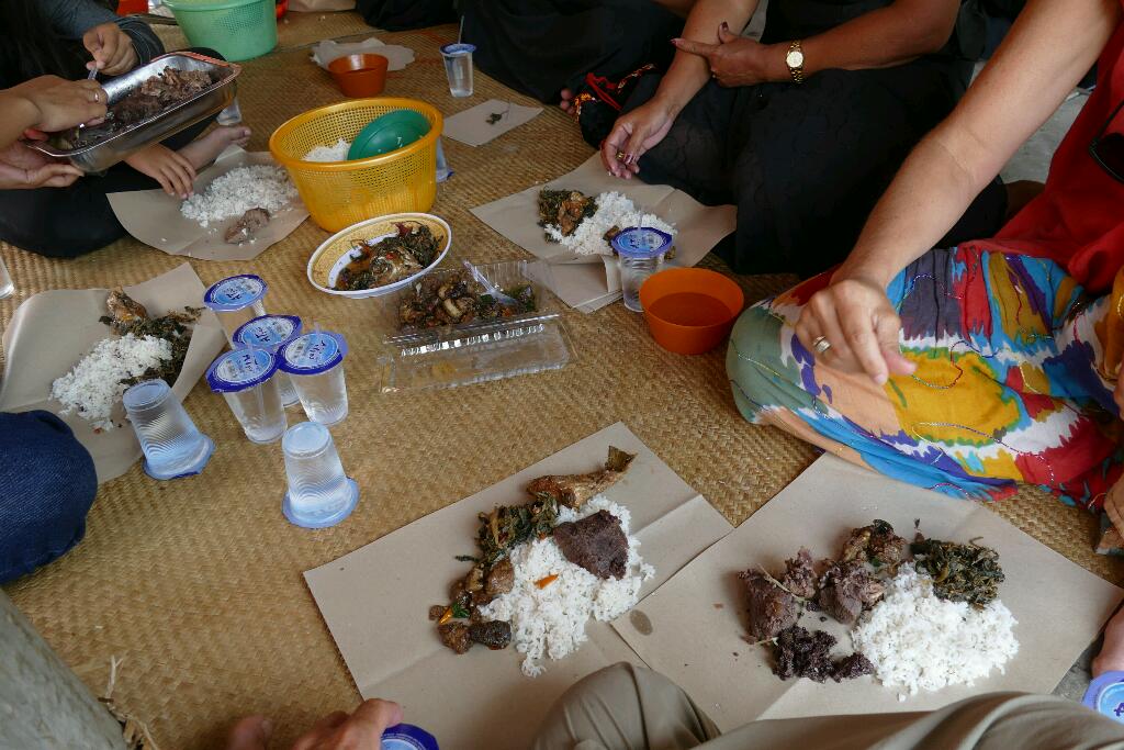 On nous sert alors un copieux repas avec ses viandes et du riz que nous devons manger avec les mains sur des feuilles de papier.