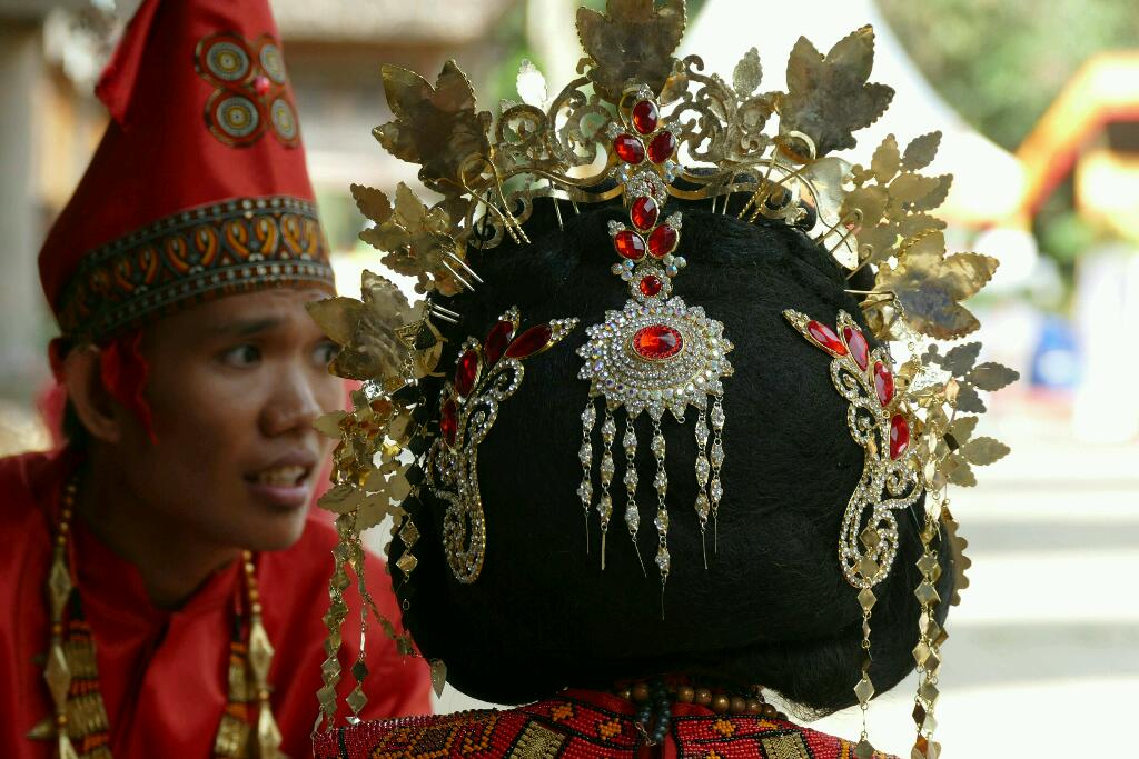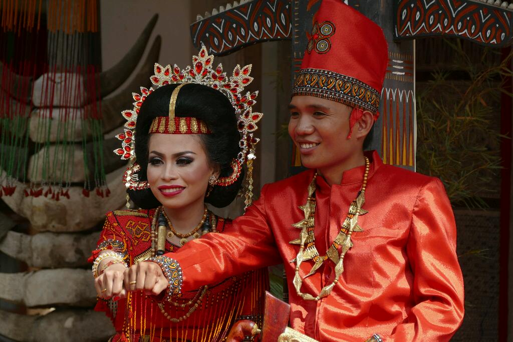 Le guide nous propose ensuite d’aller visiter un village de maisons traditionnelles. Les villages traditionnels sont tous identiques. Ils s’articulent autour d’un axe principal, avec d’un côté les habitations et de l’autre, face aux habitations, les greniers à riz, plus petits mais dans le même style architectural. Manu hésite à payer le droit d’entrée à Kete Kesu car nous sommes accueillis avec un portique fleuri et nous pensons arriver dans un piège à touristes. Nous avons simplement la grande chance d’assister à la fin d’un mariage. L’allée principale du village est ornée de bouquets. Les mariés, en costumes traditionnels, se font une joie de se faire photographier en notre compagnie. Les invités sont déjà partis, il ne reste plus que la famille proche qui nous propose alors de manger avec eux. Nous ne nous sentons pas capables d’enchaîner de nouveau un repas, nous acceptons seulement un café mais nous passons un agréable moment en leur compagnie.
