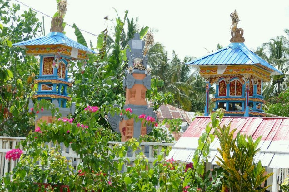 Nous avons la possibilité de louer un scooter à l’hôtel, ce que nous ne manquons pas de faire. Nous partons, munis d’un plan et des explications donnés par la petite dame de l’hôtel. Les propositions près de Tentena sont limitées. Nous avons prévu de commencer par aller voir une cascade, bien que nous ne soyons pas très fans de ce genre d’excursion. Sur la route, nous traversons « le village balinais », qui est vraiment très joli. De nombreux portiques de fleurs balisent l’unique route, avec souvent des offrandes à leurs pieds. Les maisons sont toutes bien entretenues, des pots de fleurs accrochés aux façades coquettes. Un temple, plus ou moins grand, trouve sa place dans chaque jardin, lui aussi orné d’offrandes.