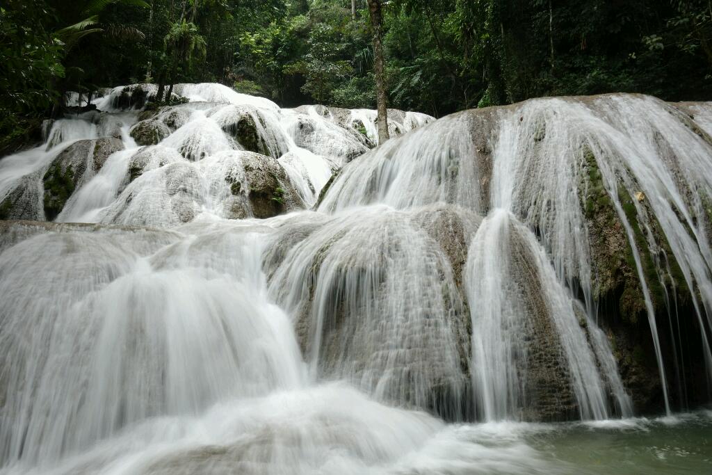 Il y a beaucoup de voitures déjà garées sur le parking de la cascade ainsi que beaucoup de scooters. Une fois notre entrée réglée, nous doublons beaucoup de familles locales qui arrivent avec leurs pique-niques pour passer la journée. Nous apprendrons un peu plus tard que c’est férié aujourd’hui car c’est une fête musulmane. Arrivés au but recherché, nous sommes littéralement sidérés par la beauté du lieu. Cette cascade est de la loin la plus jolie chute d’eau que nous n’ayons jamais vue. La batterie du gros appareil photo laisse le temps à Manu de prendre une seule photo de papillon avant de rendre l’âme et malheureusemet c’est la première fois ce matin qu’il se décharge de sa banane contenant la deuxième batterie.