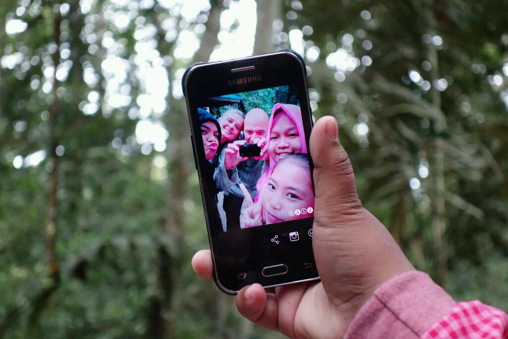 Nous n’échappons pas aux nombreuses demandes de selfies de la part de la population locale. Au retour, les nuages menaçants depuis la fin de matinée commencent à lâcher de la pluie. Nous arrivons juste à temps pour nous abriter à l’unique petite échoppe du lieu où prenons un lunch. Nous y rencontrons Wisman qui, voyant Manu et ses nombreuses tentatives d’approches de papillons, nous parle d’un endroit en haut de la cascade où les papillons sont nombreux. Photos et vidéos prises par son téléphone portable témoignent de ses propos.