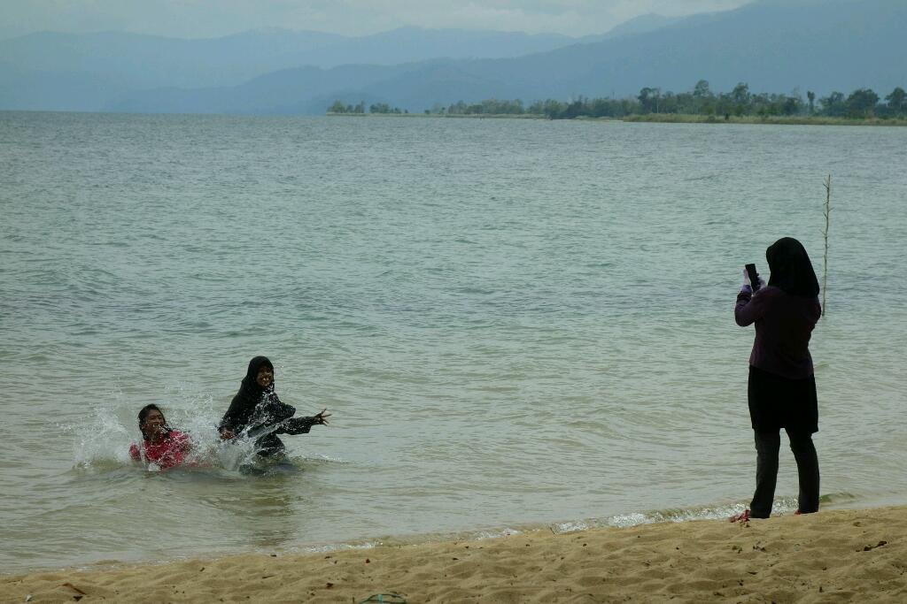 En quittant ce bel endroit, nous prenons la direction du lac Poso, deuxième point d’attraction des alentours de Tentena. Il est loin de l’axe principal et la piste pour s’y rendre est très mauvaise. Nous ne voyons pas cet endroit sous son plus bel angle à cause du temps couvert mais nous en profitons quand même un moment. Bizarrement, nous y retrouvons, avec les locaux venus le fréquenter, le côté kitsch de Tamchy.