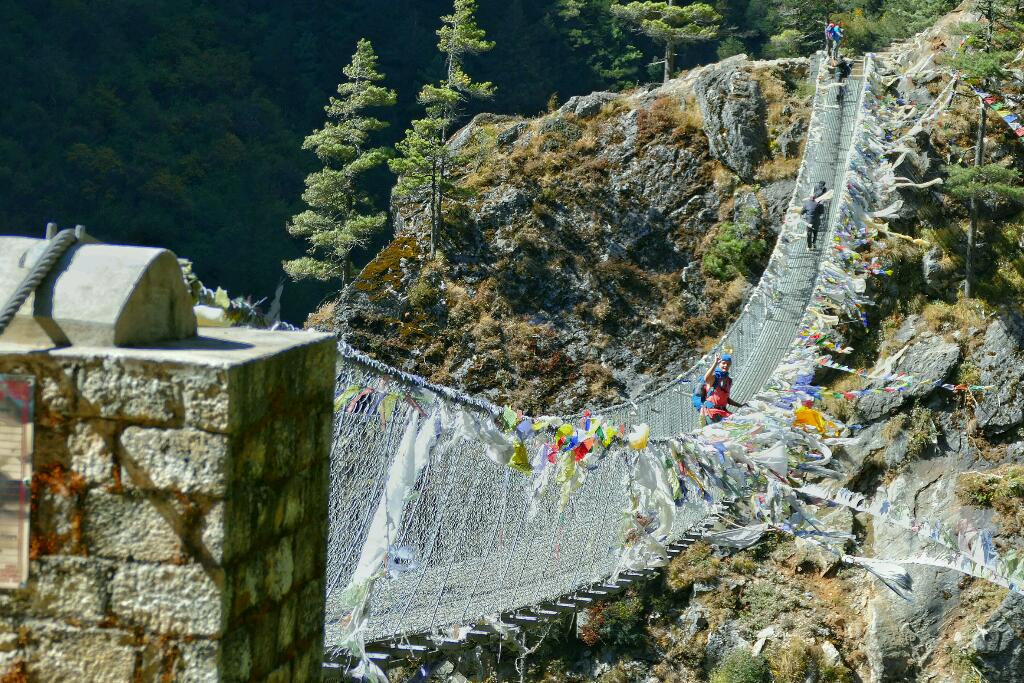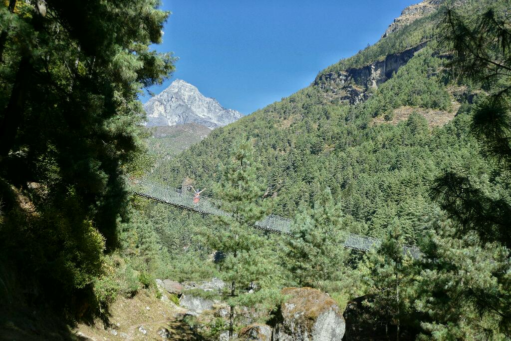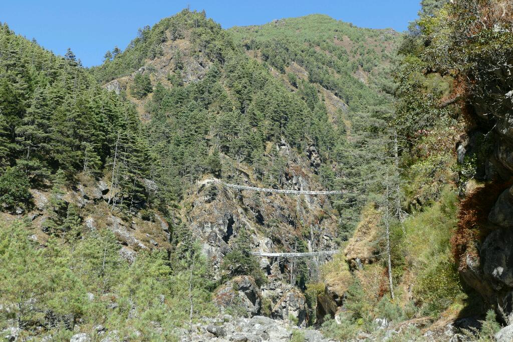Forêts de rhododendrons, de magnolias et de conifères se succèdent. Dépassé le bourg de Monjo, il faut s'arrêter au check point et payer les droits d’entrée à l’accès au Sagarmatha National Park. Sagarmatha est le nom que porte l’Everest au Népal. Une longue descente abrupte et caillouteuse nous conduit au fond de la vallée où coule la Dudh Kosi, que nous traversons à nouveau en empruntant un autre long pont suspendu. Devant nous, une longue passerelle étroite enjambe une gorge faisant plus de 100 mètres de profondeur. De l'autre côté du pont, le sentier semble se perdre dans la forêt.