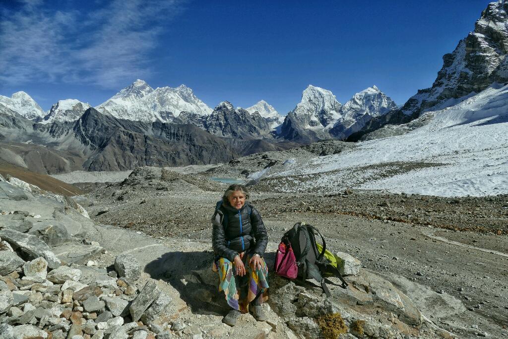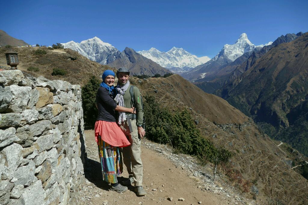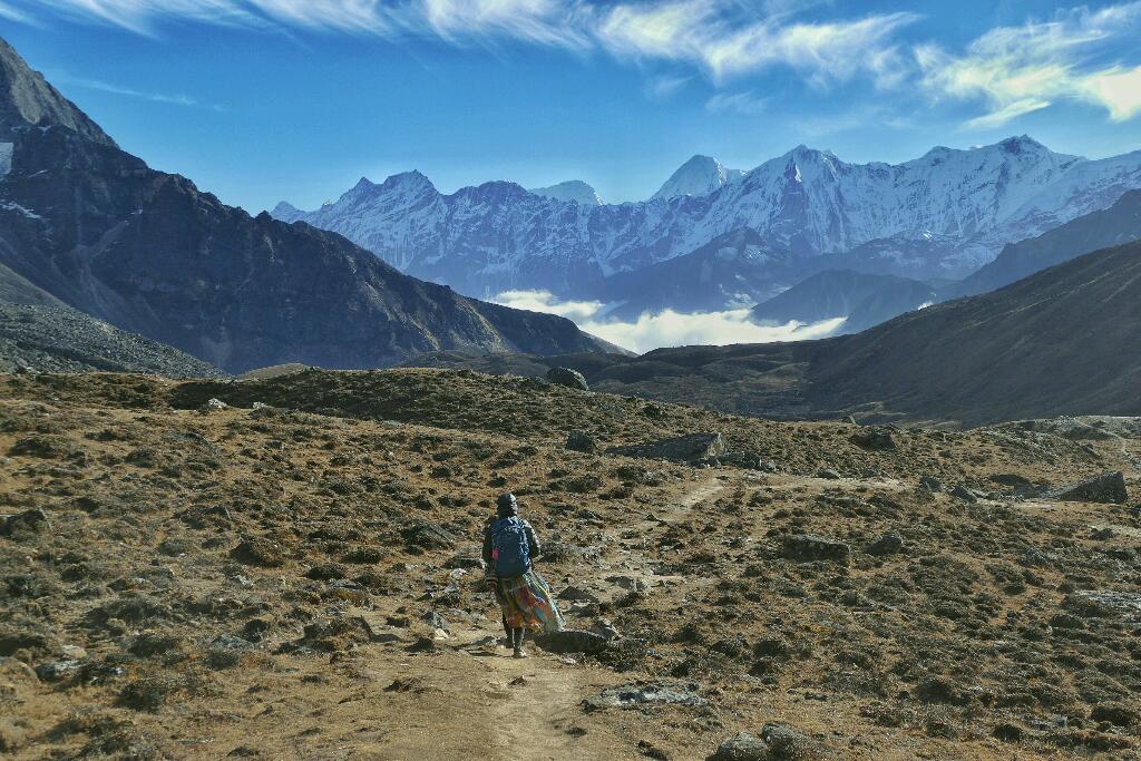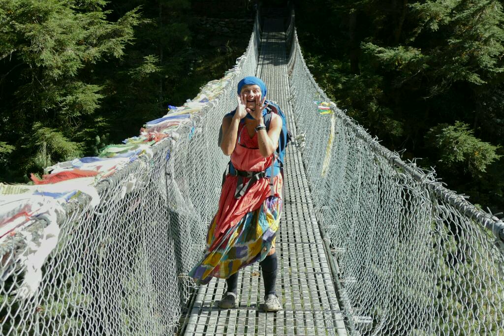 Nous nous échappons du village de Namche Bazaar par un sentier étroit tracé à flanc de montagne. On peut lire, dans mon regard, de la joie mais aussi beaucoup d’inquiétude même si je me sens prête à affronter le défi de ce trek.