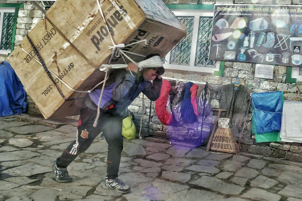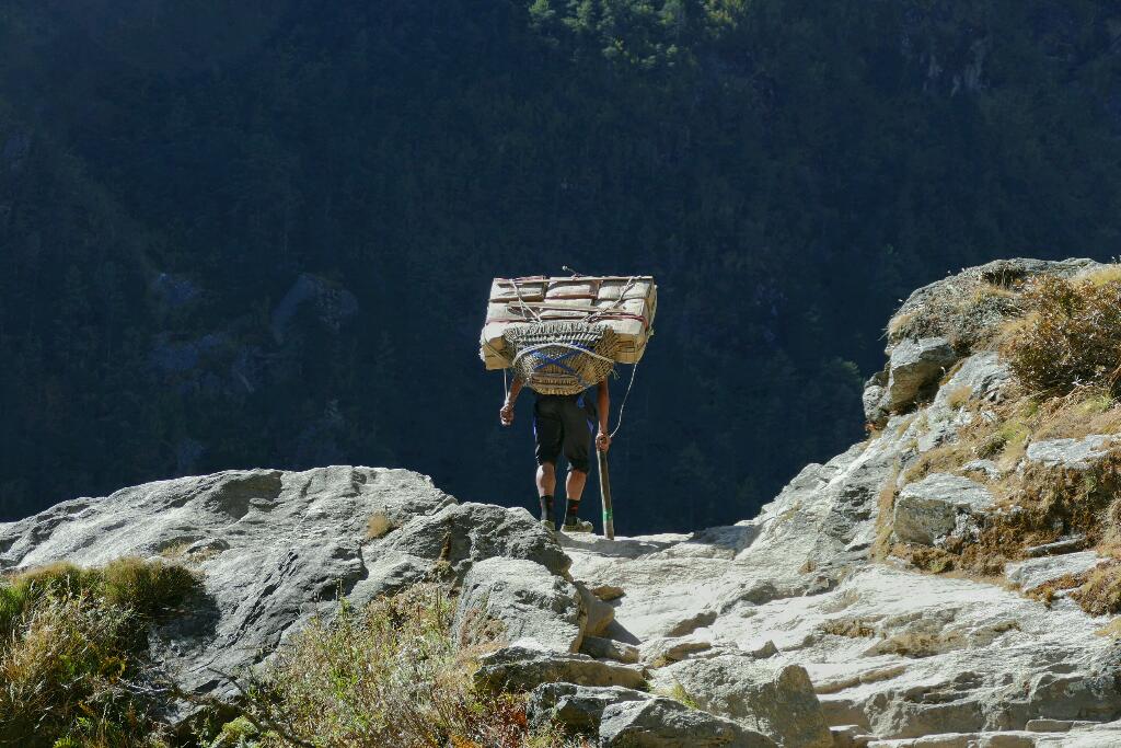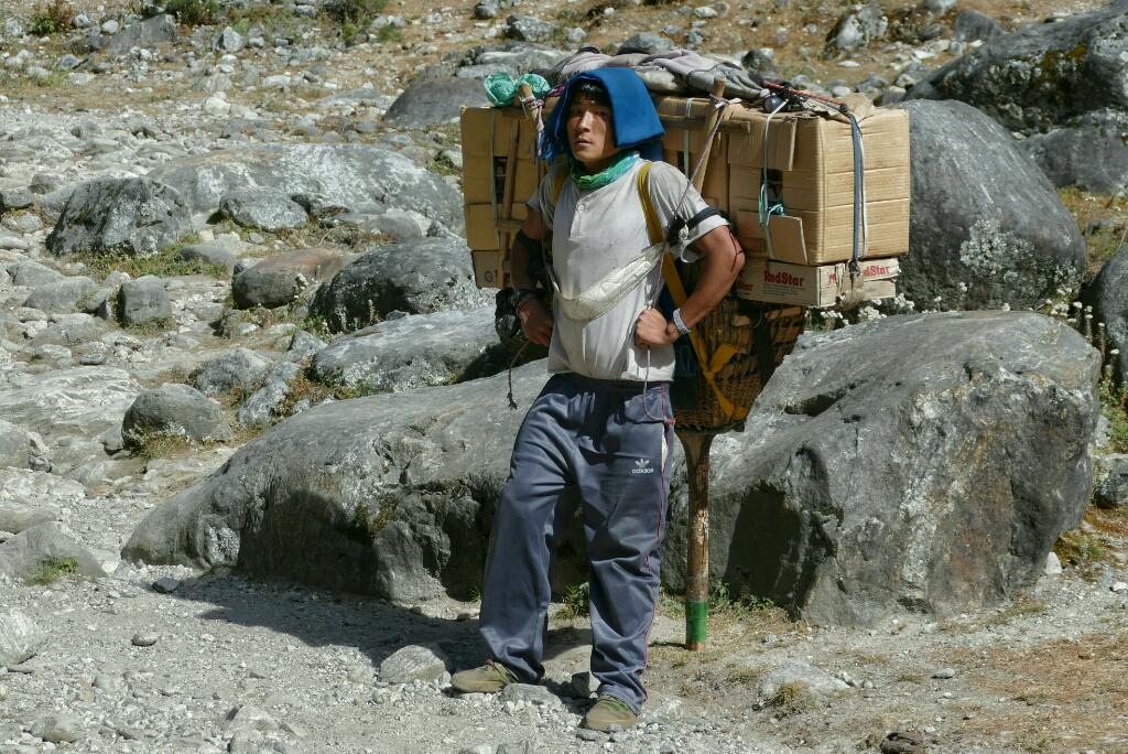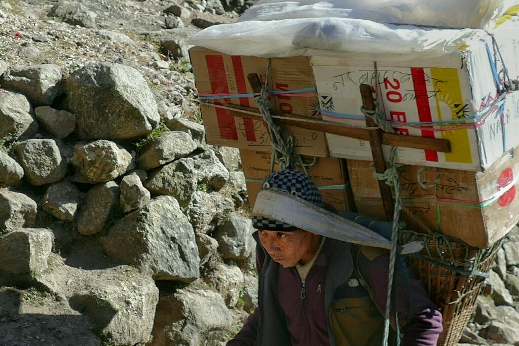 Ce qui m’impressionne le plus, ce sont les porteurs. Le langage populaire a consacré l'usage du mot « sherpa » pour désigner ceux qui accompagnent les expéditions himalayennes, notamment les porteurs. C'est en portant effectivement que le peuple Sherpa s'est fait connaître. Mais le terme Sherpa désigne plus justement une ethnie népalaise d'origine tibétaine , un peuple venu de l'est... shar (est) et pa (peuple). On en croise des dizaines, très lourdement chargés de sacs de touristes, de vivres pour les hôtels ou les boutiques, de bouteilles de gaz, de plaques de contreplaqué …Les porteurs, en fait pour la plupart des Rai et des Tamangs, se situent au bas de la hiérarchie, sous les guides, les cuisiniers et les aide-cuisiniers Sherpas. Ils empilent les bagages sur un doko, une sorte de hotte en vannerie déjà remplie à ras bord. Une fois les bagages fixés avec des bouts de cordes usées et pleines de nœuds, ils s’accroupissent et, s’aidant du namlo, un bandeau frontal fait de cuir, de corde tressée ou de tissu passé sur leur front, ils soulèvent leur charge en titubant, puis partent à petits pas. Il est difficile d'évaluer le poids des charges. La norme serait d'une trentaine de kilos. Pour un petit supplément à leur tarif horaire, je crois que plusieurs porteurs portent bien davantage. Le transport à dos d’hommes, malgré son apparente simplicité, requiert d’importants aménagements : grands chemins biens marqués (ce qui rend la marche bien plus facile pour nous par comparaison aux pistes empruntées en Inde), murets de pierres fréquents permettant de soulager les porteurs qui y déposent, de temps à autre, leurs lourdes hottes sans avoir à se baisser jusqu’au sol. Ils soulagent aussi leur dos en appuyant la base de leur hotte sur leur long bâton en forme de T, le tockma, qu’ils utilisent par ailleurs pendant la marche comme canne de soutien dans les passages difficiles. Nous observons que la plupart des porteurs optent pour une stratégie de marche particulière: ils progressent rapidement, même en montée où ils préfèrent les ascensions courtes mais raides; et en contrepartie ils font des pauses longues et fréquentes. Lorsqu'ils se déplacent, ils foncent le plus souvent droit devant eux, pouvant de toute manière à peine lever les yeux de la piste pour anticiper le croisement des autres marcheurs.