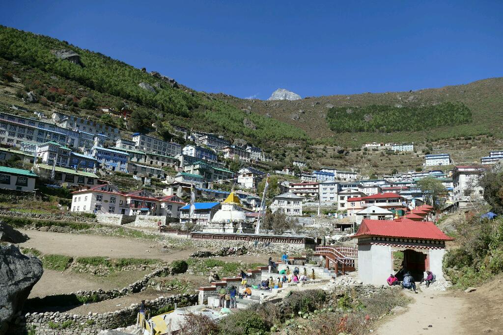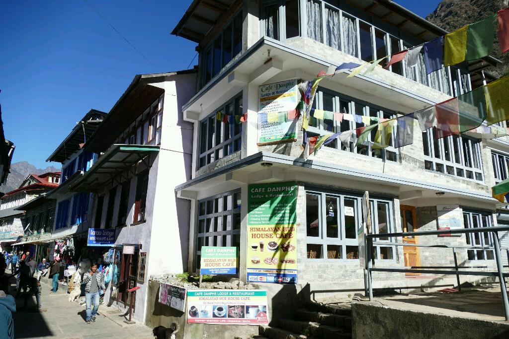 Nous avons mis trente minutes de plus pour cette étape jusqu’à Namche estimée à 4 heures dans notre guide. Cela qui correspond aux deux arrêts obligatoires des soldats. Les sentiers étroits et caillouteux se transforment en ruelles reliées par des paliers et des escaliers de pierre. De chaque côté, maisons, auberges et boutiques s'entassent les unes sur les autres. Électrifié, le village dispose d'une école primaire, d'un bureau de poste, d'un dispensaire, d'un mini-poste de police, du téléphone et de quelques cafés Internet. On peut y acheter à peu près n'importe quoi : vêtements, bijoux, équipement de haute montagne, cloches à yack, pâtisseries fraîches, pizzas, tarte aux pommes, coca, bières locales et importées... Nous nous engouffrons dans une pizzéria avant même de trouver un hôtel car il nous faut une connexion internet pour faire une comparaison sur Tripadvisor. Après avoir renoncé à monter vers un établissement bien évalué, mais situé sur la crête surplombant le village, nous sélectionnons une pension en plein centre de Namche (simplement nommé Hotel Namche), très bien coté également. Il est un peu cher mais depuis Namche, c’est comme si tous les prix avaient été multipliés par 3. Nous obtenons l'une des dernières chambres disponibles dans la catégorie économique, située à l'étage inférieur en bordure d'une terrasse un peu froide. Nous avons tout de même une salle de douche privée, des matelas acceptables et plusieurs prises électriques alimentées en permanence, ce qui est un luxe plutôt rare sur ce parcours. On nous promet de l’eau chaude solaire mais la réserve doit être vide car une fois sous la douche, l’eau est tout juste tiède.