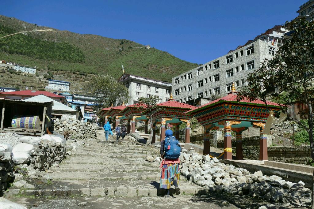 Nous traversons le village de Lukla : vieilles habitations en pierres, lodges et bhattis, petites boutiques où l'on peut se procurer équipement de montagne et souvenirs divers, enfants courant sur le sol poussiéreux et poules picorant dans les détritus jonchant le sentier.