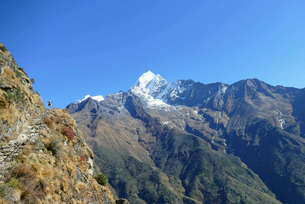 À la hauteur de Lhabarma, où nous nous arrêtons pour déjeuner, la vue porte loin dans toutes les directions. C’est magnifique. Le soleil donne dans le lodge alors nous nous installons derrière la vitre et je prends une soupe à l’aïl pour me réchauffer (c’est mon menu depuis le début du trek car c’est recommandé pour lutter contre le mal des montagnes) et Manu mange son premier dal bhat (Le un plat traditionnel du Népal, composé de riz blanc et d'un bol de soupe aux lentilles, le tout agrémenté d'un curry de légumes et parfois d'un mélange d'ingrédients épicés. La viande étant peu accessible et non traditionnelle, il est généralement végétarien).