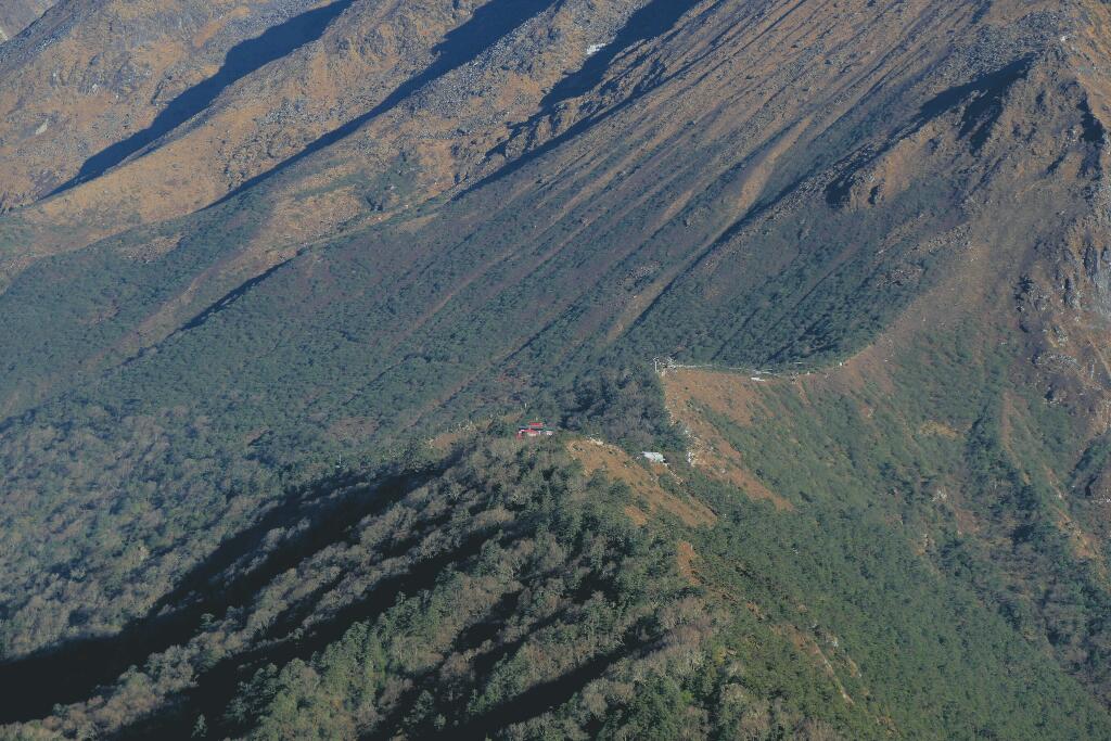 Quelques lodges (gîtes rustiques) et bhattis (maisons de thé) flanquent un petit sentier en terre battue qui contourne la piste. Battant au vent, une longue pièce d'étoffe attachée à un mât à prières laisse s'échapper vers les dieux les prières bouddhistes qui y sont inscrites. Nous avons changé d'univers.