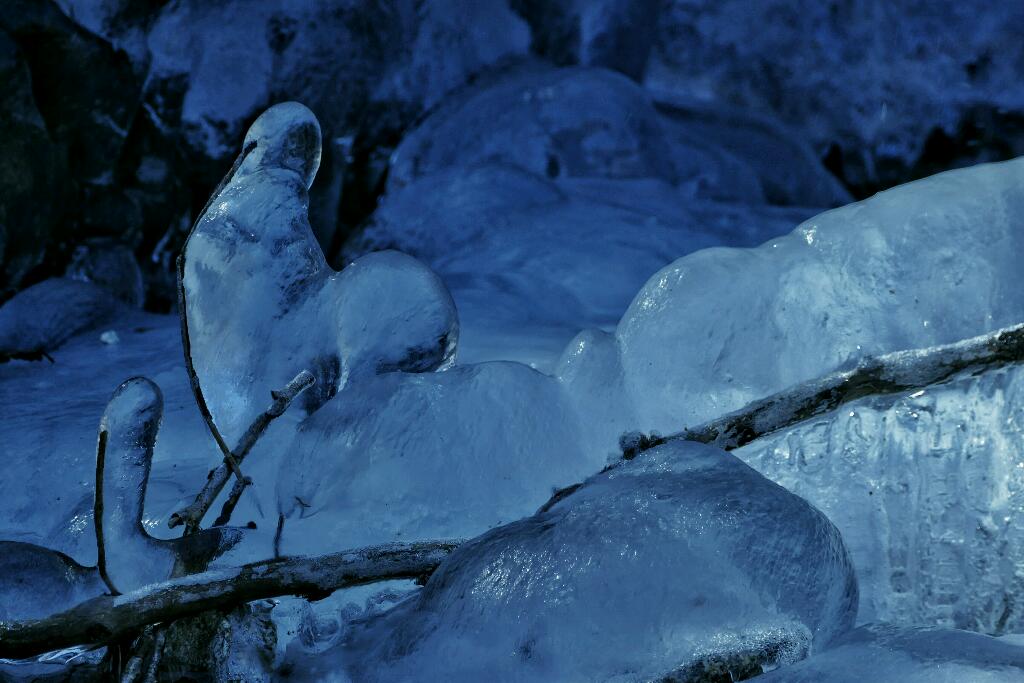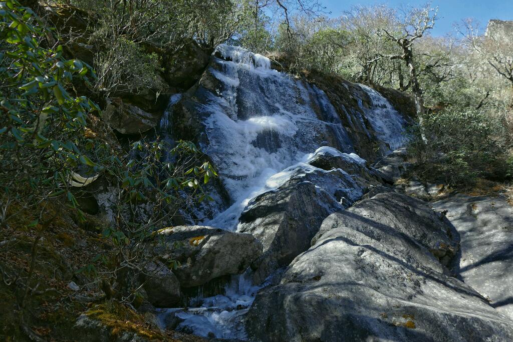 Nous montons à travers une forêt de rhododendrons. La montée est abrupte pendant 4 heures. A un moment, nous longeons une cascade de glace.